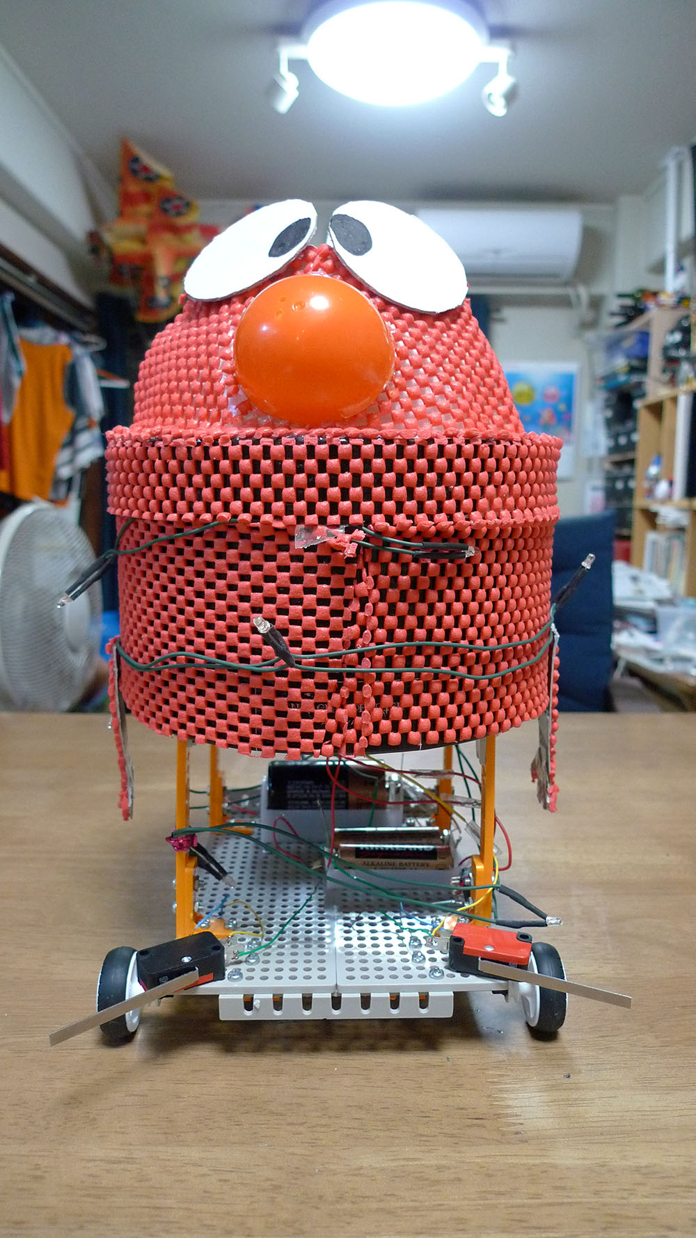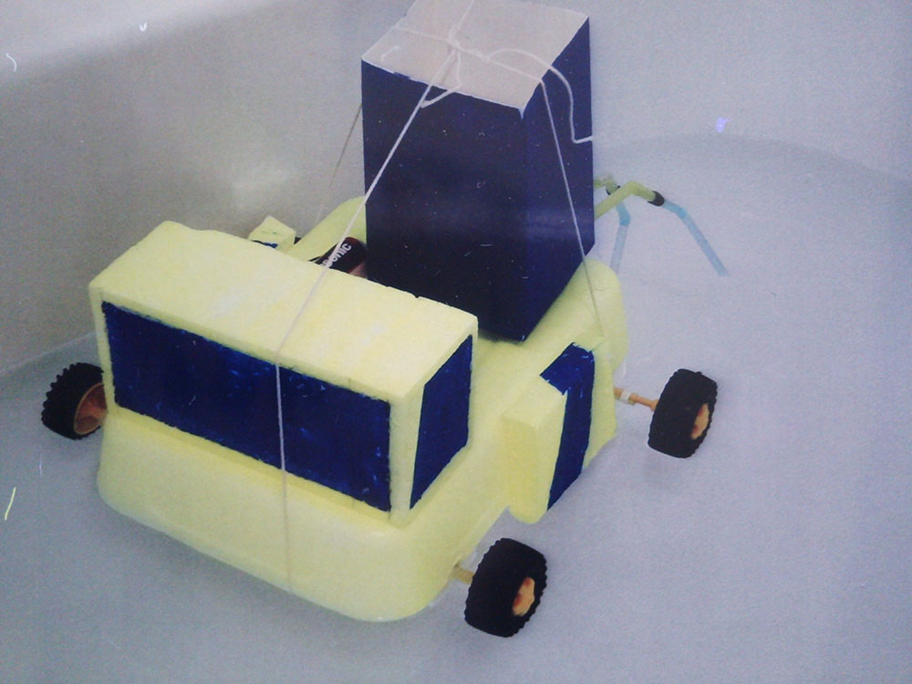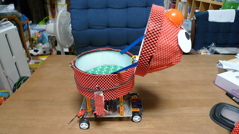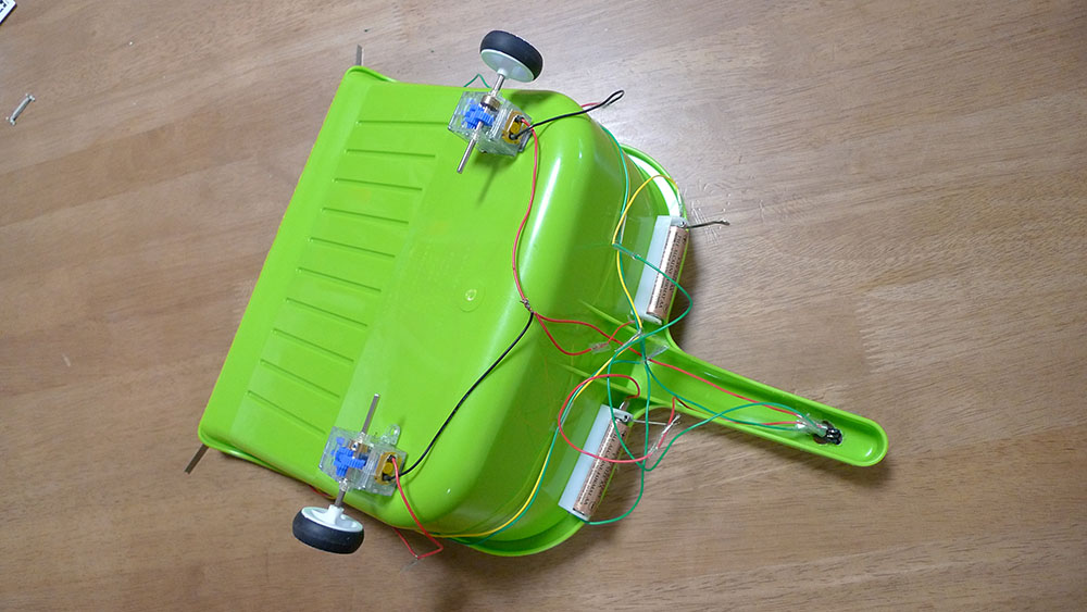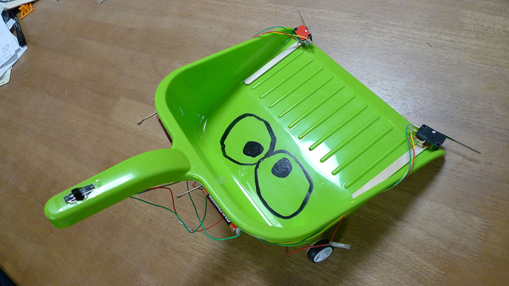 作者:智丹 さん (小4・千葉)ひと目でそうじ用メカであることがわかるこちらの作品は智丹さんの「おそうじらくらくちりとり君」! フロントの両サイドに装着されたスライドスイッチのオンオフがリアのギヤボックスを制御するシステムになっており、主電源を入れるとちりとり君は前進、スライドスイッチをほうきでタッチすると押した方のタイヤが逆転、方向転換をする仕組みになっています。ロボの操縦を楽しみながら掃除もできちゃうナイスな1台、ゆるキャラ風の目もいい味出してます!!