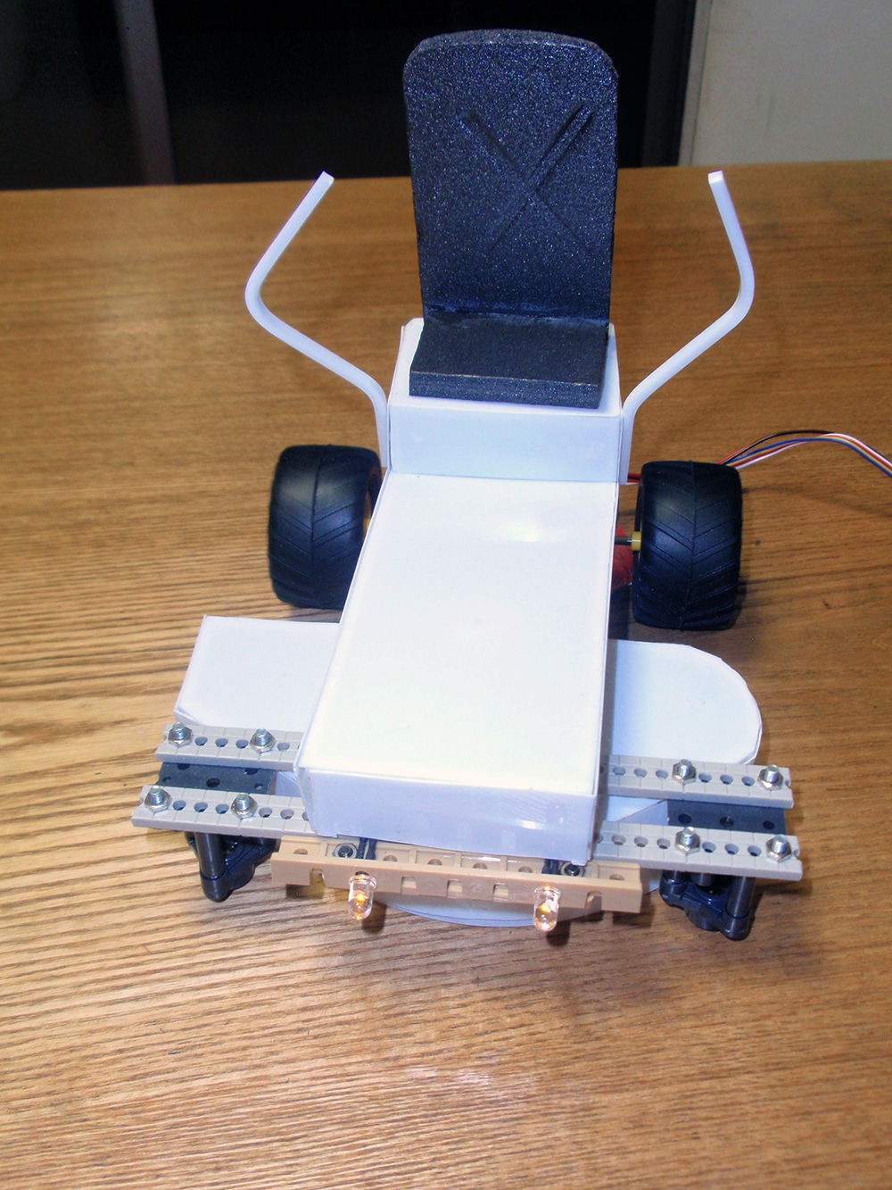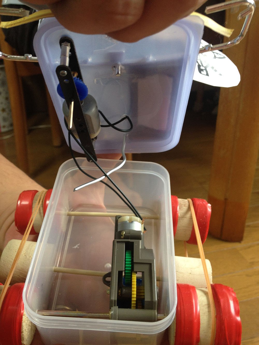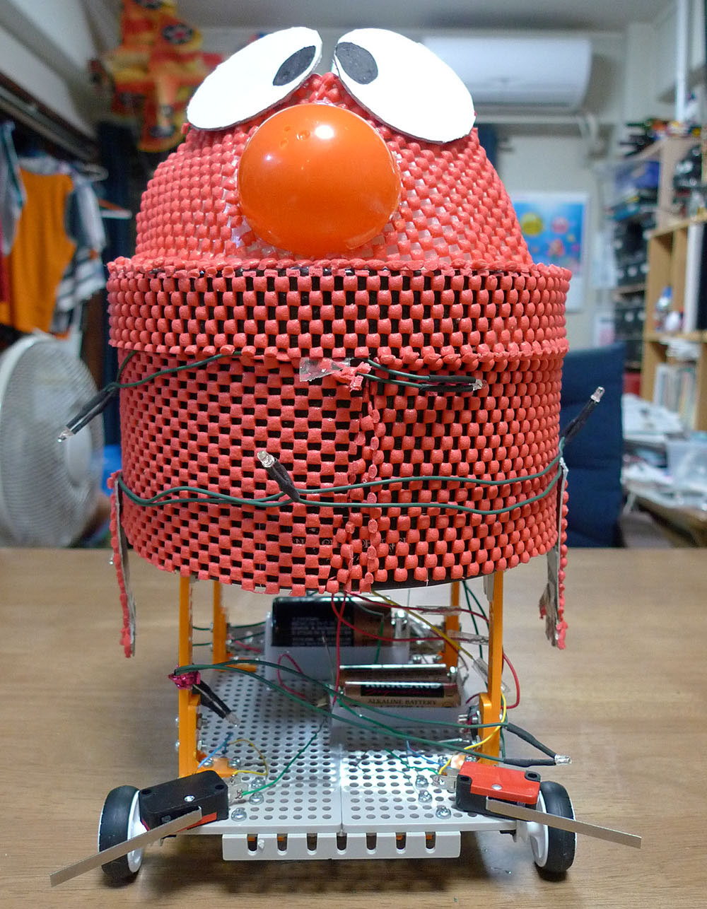 作者:智丹 さん (小4・千葉)ひと目でそうじ用メカであることがわかるこちらの作品は智丹さんの「おそうじらくらくちりとり君」! フロントの両サイドに装着されたスライドスイッチのオンオフがリアのギヤボックスを制御するシステムになっており、主電源を入れるとちりとり君は前進、スライドスイッチをほうきでタッチすると押した方のタイヤが逆転、方向転換をする仕組みになっています。ロボの操縦を楽しみながら掃除もできちゃうナイスな1台、ゆるキャラ風の目もいい味出してます!!