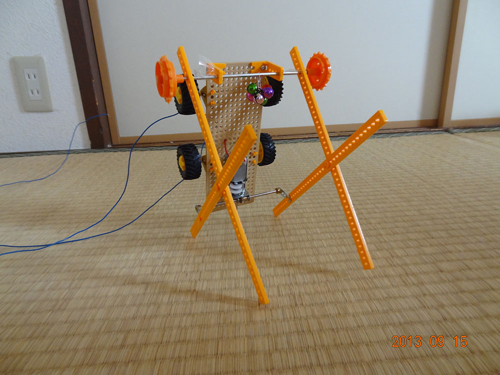 作者: 考太朗 さん (小2・大阪)『自動うちわの研究開発中にひらめいた』という「DAN-RUNお祭りロボット」! DAN-RUNのDANは「ダンシング」、RUNは「ランニング」から来ているというこのメカ、なんとタイヤからの動力伝達はナシ! 通常モードではアームの動きでほふく前進のように進み、逆立ち状態にするとアームを軸に踊るように進むという2パターンの移動が可能な斬新メカ。それじゃあ何がお祭りなのかな…?動画を見れば納得、このメカには鈴が付いているんです! この鈴のおかげでメカが動くたびにシャンシャンサウンドが鳴り響き、部屋はお祭りムード一色に! 家族の団らんを和ませる、かなりゆかいな工作メカです!