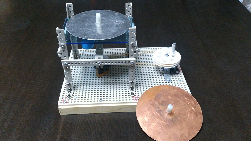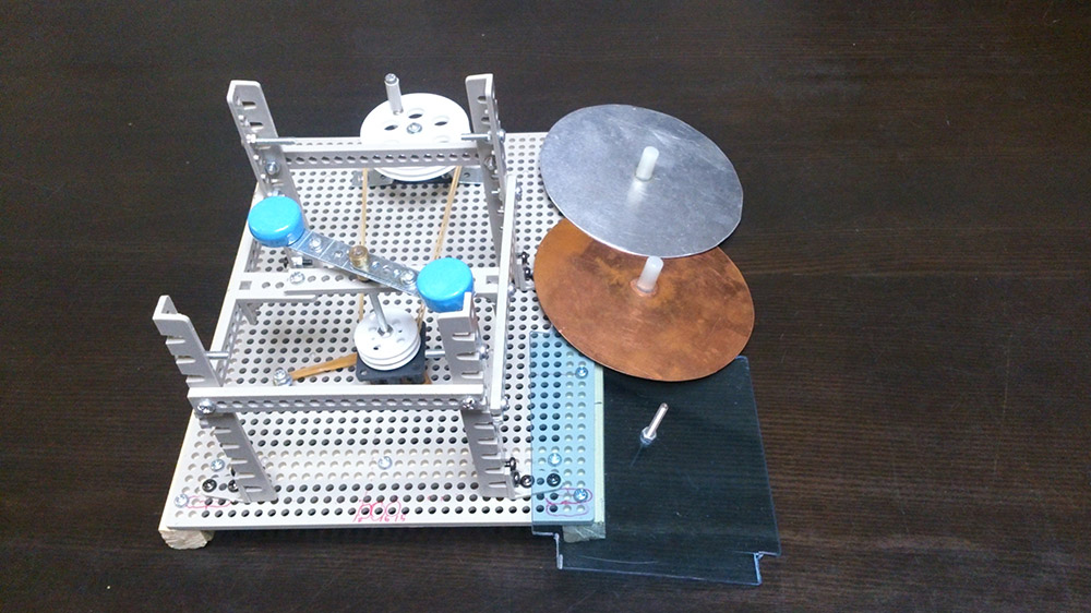作者: 優詩 さん (小6・鹿児島)もともと磁石にくっつかない材質である銅やアルミの円盤。でも、これらの円盤の近くで磁石を動かすと、それにつられるように円盤がクルクル回転する…というのが「アラゴの円盤」。モーターの基礎として紹介されることの多いこの原理を体験できる機械を、優詩さんは工作キットで作ってしまいました! すごいです! 機械中央の台座部分に設置された磁石はプーリー(小)と連結されており、この上に円盤をセットして外側にあるハンドルつきのプーリー(大)を回すと、その力がプーリで経由で磁石に伝わり磁石が回転。それにつれて徐々に円盤が回転を始める…という仕組み。頭ではわかっていても、これを実際に体験すると不思議な気持ちになりますよね〜。いかにも研究機械! という理系なフォルムもステキです!