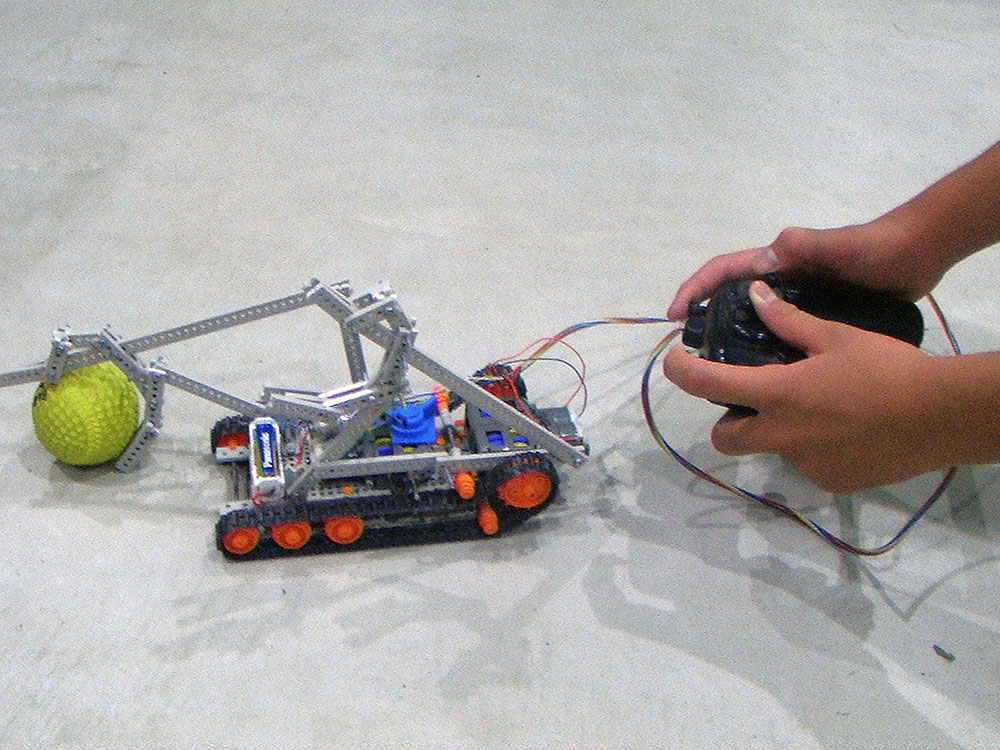 作者: そら さん (小6・東京)同じパーツを使っていても、作者の設計思想次第でまったく違うフォルムに仕上がっていくのがロボット工作の面白さ。そらさんの「ボール運びロボット」は、小さな物をつかめるように開発された作業ロボットです! ご覧の通り、ソフトタイプの野球ボールもしっかり保持できるように仕上がっています。情報によるとピーマンも掴めるとか! メカのレイアウトも美しく、電池ボックスをフロントにおいて重心を前にしている点には工夫を感じます! あと、フロントに3セット配した転輪と、クッと上に跳ね上げられた駆動輪がメカ好きにはグッときます。カッコいいですねぇ…。