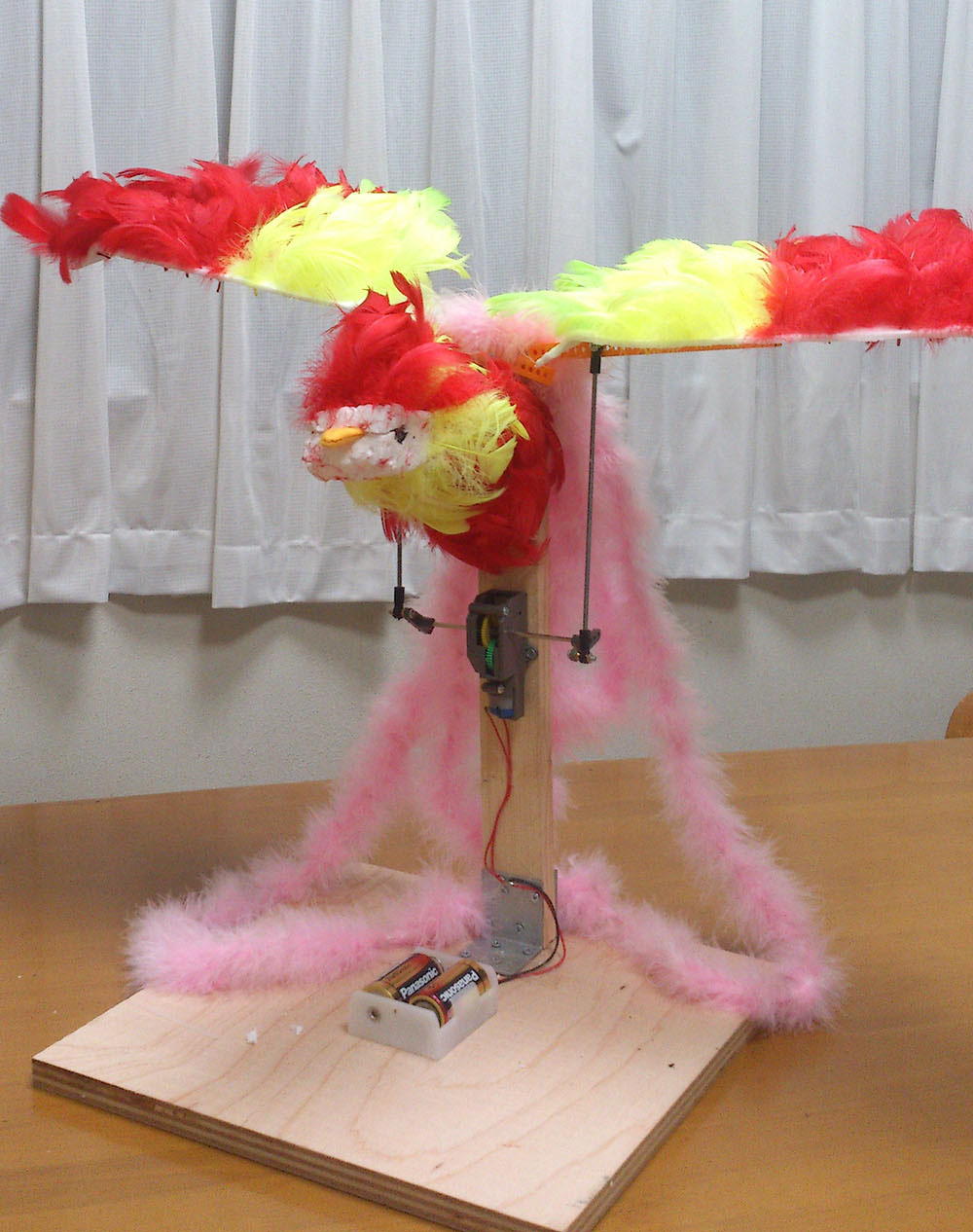 作者: こうちゃん (小6・大阪)巨大な翼がインパクト満点のこちらの作品は、こうちゃんの「フェニックス」! クランクギヤーボックスからの動力がアームを介してフェニックスに伝わり、バッサバッサと翼を動かします! いままでに無いタイプの工作作品ですね〜! 動きのメカニズムだけでなく、フェザー素材をふんだんに使ったフェニックスのフォルムもリアリティ満点、このまま特撮映画に使えてしまいそうな完成度です!