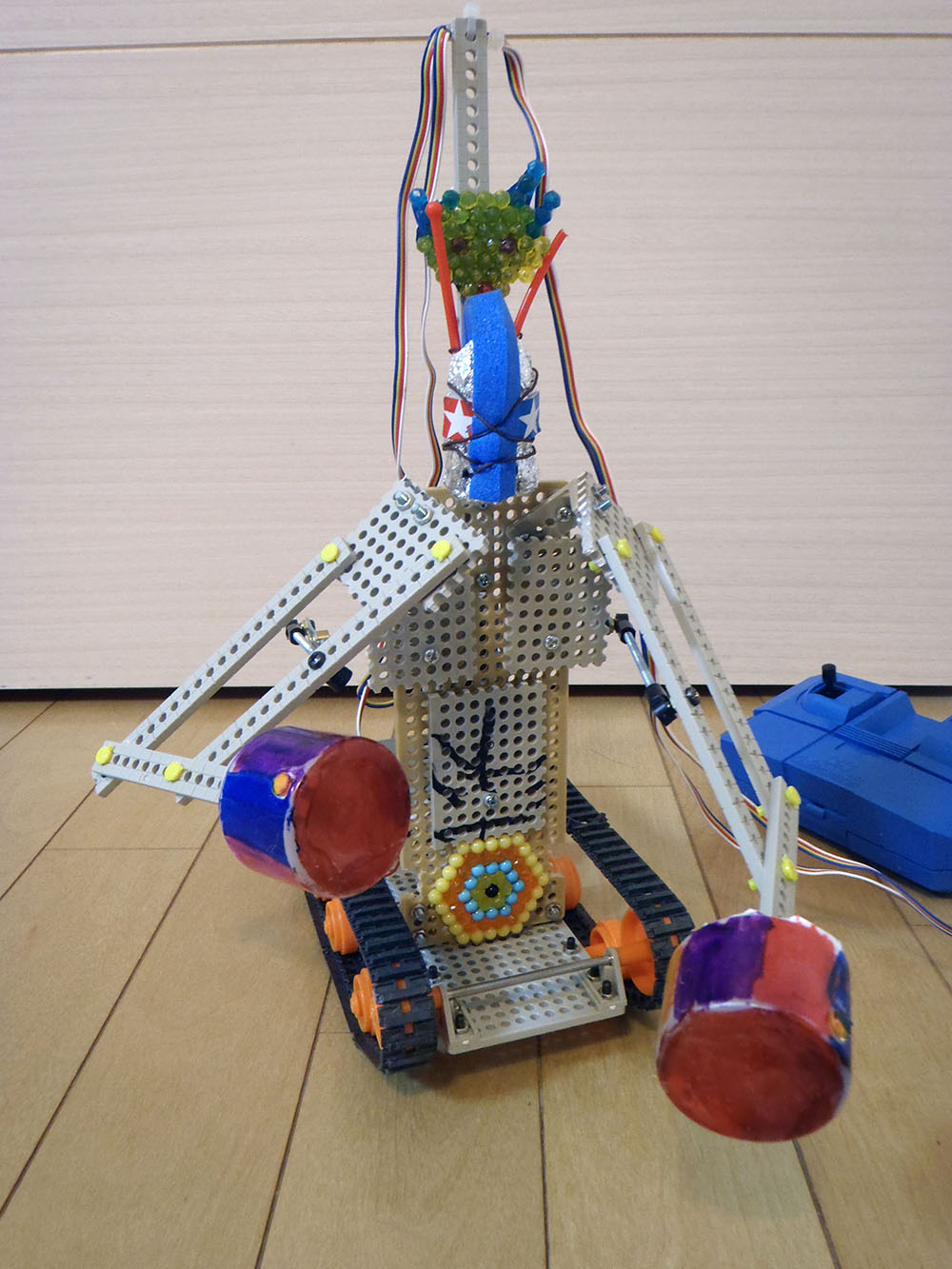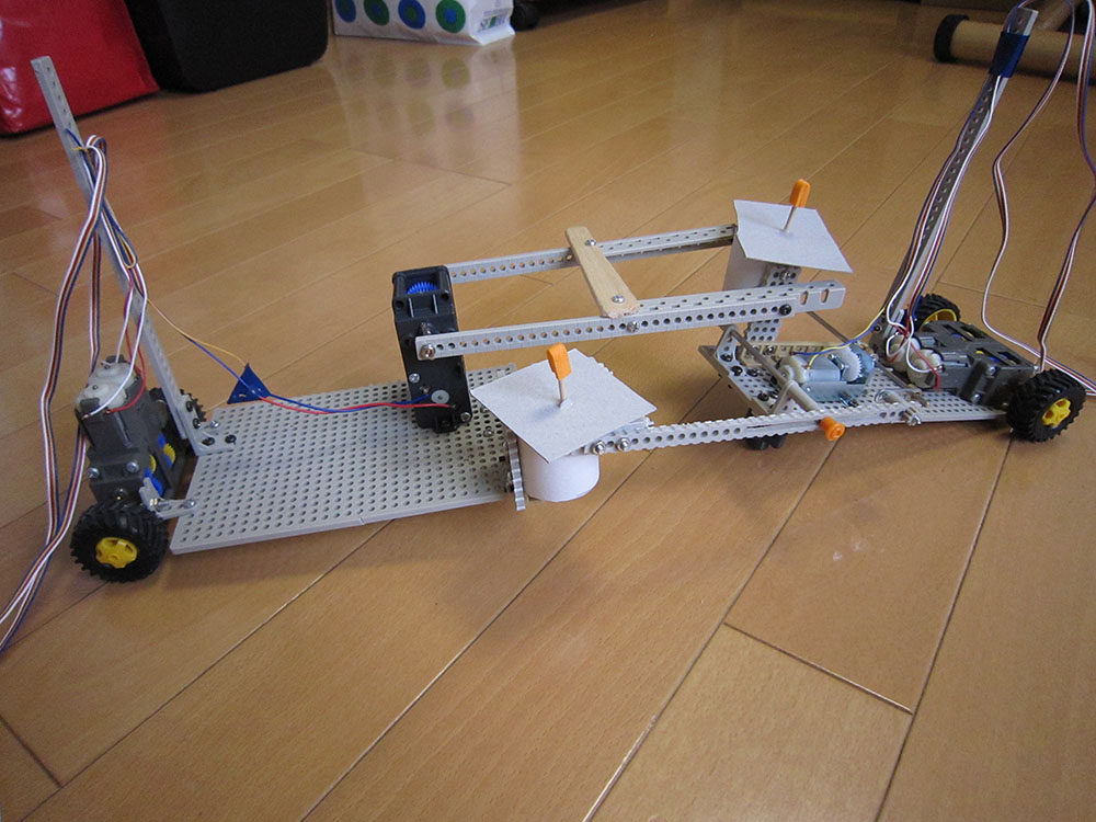 作者: こっさん (小5・東京)こちらの作品はこっさんの「騎馬戦ロボット」運動会でおなじみの「騎馬戦」と同じ要領で、ロボットに搭載されたコマを落としあう、2台一組の対戦システムです。アームの動きはフロントのギヤボックスが受け持ち、前後左右の基本動作はリアのギヤボックスが担当しているのですが、アーム形状とコマの絶妙なポジションが相まって、えらく面白そうです! ブンブンアームを振り回して戦うもよし、戦略的に動くもよし。色々な戦法がイメージできて、遊んでみたくなりますね〜! これ、学校に提出したら体験希望の行列ができちゃうんじゃないでしょうか…?