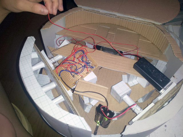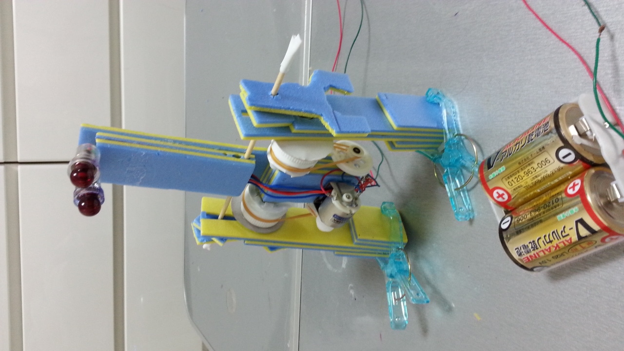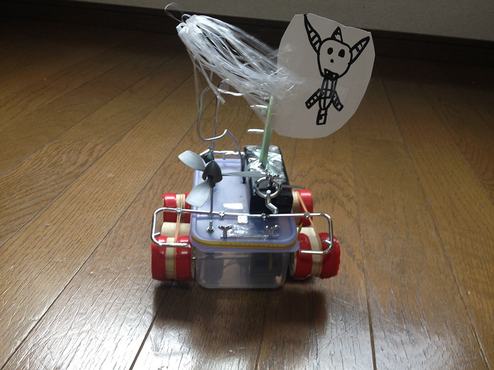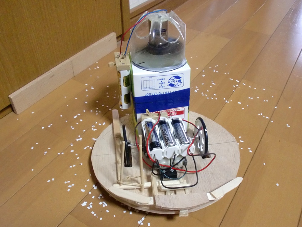 作者: ゆったん (小5・北海道)『こまめに掃除しないとアレルギーで鼻がムズムズする…』とお悩みのゆったんの作品は「お掃除ロボット」! ロボットが壁にぶつかると片方のタイヤが逆回転して方向転換、壁から離れると前進開始するというお掃除ロボの基本動作をしっかり実現しています。注目すべきはそのフォルムで、スイッチ類も含めてすべて紙で作ったというその姿は本格的な掃除ロボットと負けないスタイリッシュぶり。紙だけでここまで作れてしまうとは驚きです!