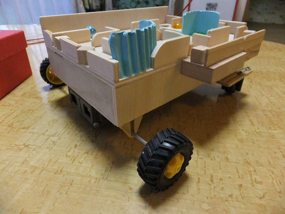 作者: 理 さん (小6・兵庫)『曲がりながら進む車を作りたかった』という理さんの作品は「観光バス」。最近のおしゃれな観光バスを思わせるさせるウインドウのデザインが目を引きますが、注目すべきはそのメカニズム。こんな小さなマシンの中に、駆動システムとステアリングを自動操作する仕組みが備わっているのです! プレゼン動画もご注目。(動画1 動画2)最初に動画を見た時は、「え、これRCなの?」 とびっくりしましたよ! しかも動力に使っているのはシングルギヤボックスひとつだけ。こんなシンプルな機構で、これだけダイナミックな動きを作り出してしまうとはお見事です!
