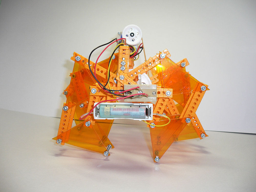 作者: あおい さん (小4・宮城)テオ・ヤンセン氏のアート作品「リノセロス」を見て面白いと思ったというあおいさんの作品はその名の通り「リノセロスっぽい歩くロボット」。WEBで見つけ出した動作機構の解説テキストを参考に作ってみたそうですが、ユニバーサルアームの穴の位置を活かせるように、全体の寸法をアレンジしたそうです。家族に協力してもらいながらの制作だったそうですが、努力のかいあって、ワシワシ動く独特の挙動がしっかり再現されています。全体のカラーバランスもいい感じで、このままロボクラフトシリーズにあっても違和感なさそうです!