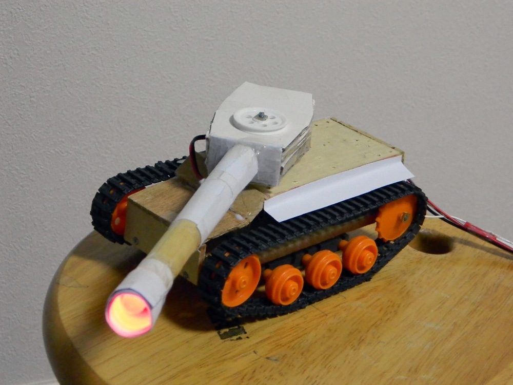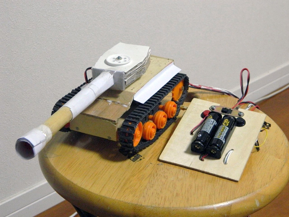 作者: とびばこ さん (小5・三重)とびばこさんの作品は「リモコン戦車」! タイガーIを思わせる砲塔に巨大砲を装備したリモコン戦車です! 『砲塔が360度回転できるようにリモコンの配線を工夫した』というとびばこさん。砲口にはライトが仕込まれており、リアルな射撃アクションも楽しめるエンターテインメント仕様。こういったマシンでふとんや雑誌を乗り越えて進軍するのは楽しいんですよね…。久々に戦車遊びがしたくなる工作作品です!