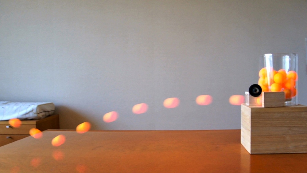 作者: ザ・ウメボシ さん (小5・千葉)ザ・ウメボシさんの作品は、卓球の練習に使える「ピンポン球発射機」! 『持ち運びができます』というコメントが添えられているあたり、実際に使うことを想定して作られている作品であることがうかがえます。モーターにタイヤを直接装着して回転させることで、筒に入ったピンポン球を高速発射できるようになっています。連続写真でみると安定した着弾を実現していてかなり役立ちそうです! ちなみに工作パーツでピンポン発射機を工作パーツで作るというのはピンポン業界では結構定番のようなのですが、球を1つずつ発射筒に流しこむための機構は皆さん工夫を凝らしていて勉強になります。うちの学校にも卓球クラブがあるよ、なんていう方は、実験がてら挑戦してみては?