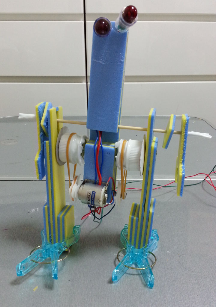 作者: 映児さん (小4・東京)続く作品は二足歩行ロボット「ズンビ2号」! 作者は『クラスの友達に見せたら「歩くだけ?」と言われた…!』という映児さん。…そうなんです、歩くメカを作り上げる苦労と歩行成功のよろこびは、作ったことのある人にしか分からないのです! プーリーからボトルキャップに動力を伝えるというアイデアの素晴らしさやモーターが下にある理由、洗濯バサミが足になっている理由…などなど、ズンビ二号にはロボット制作の経験者なら「なるほどね!」と思うことが満載。大丈夫、このサイトを見ている工作ファンの皆さんは、映児さんに心から拍手を送ってくれるはずですよ! パチパチ!