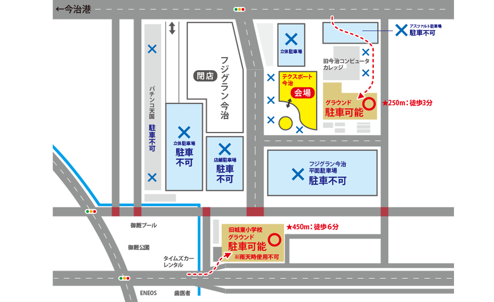 ・会場のテクスポート今治と各駐車場との移動距離・時間は以下をご参考ください