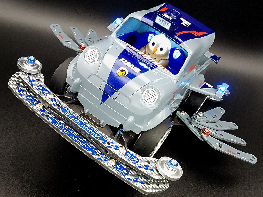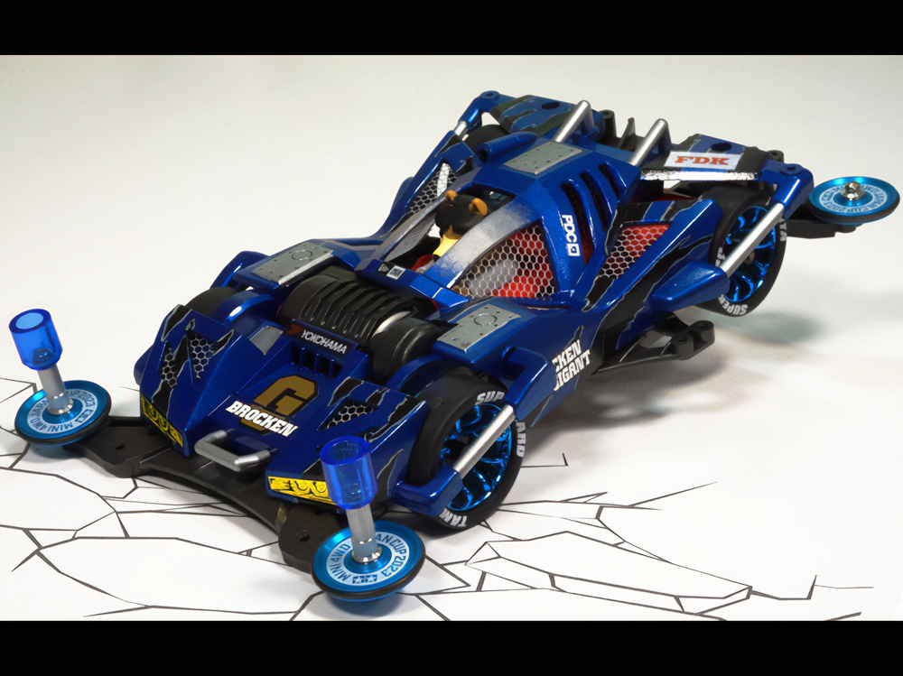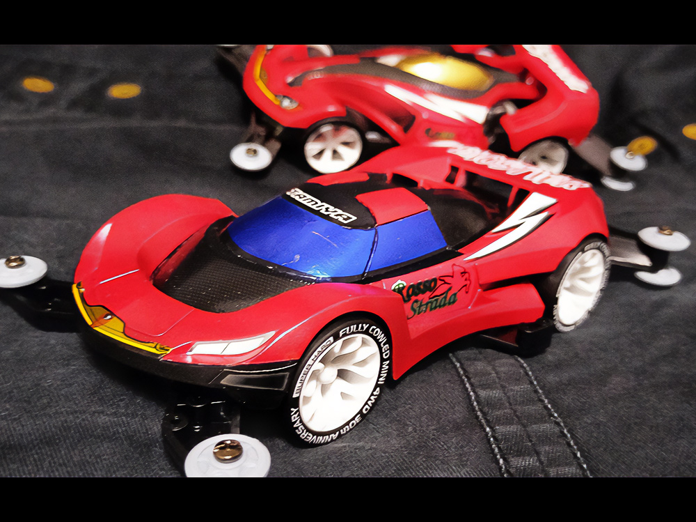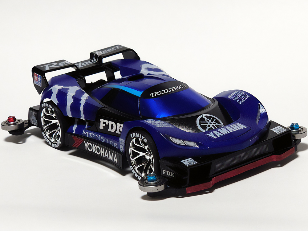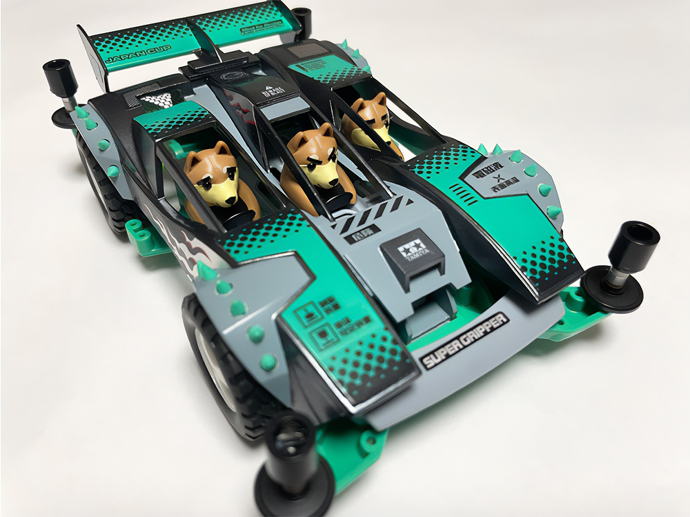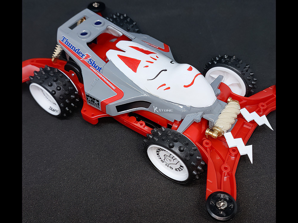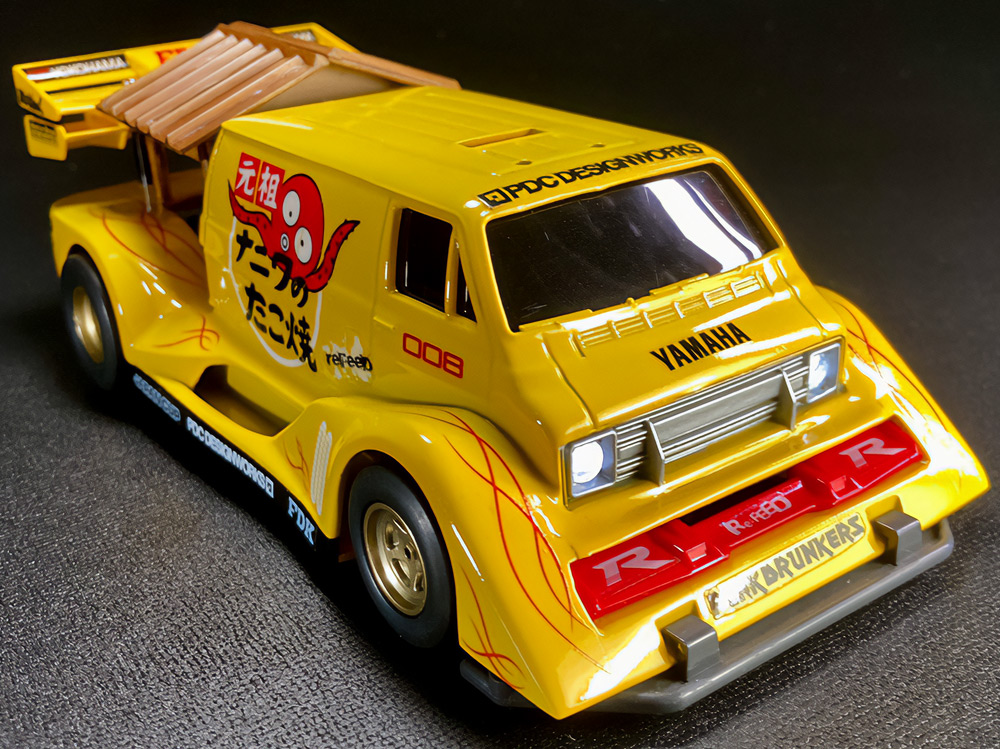 「まず、一目でビクトリーマグナムだと分かってもらえるように細部を作り込み過ぎないように注意しました。"豪"の文字の肉抜きは、少年時代に一度挑戦して失敗した経験があったので、今回は完璧に成功させることが出来てよかったです。シャーシには90年代当時物の男心を擽るデザインのスライドダンパーや、内部のギヤーが見えるスケルトン素材のパーツも取り入れて『メカ+スケルトン+発光』の男子が憧れた近未来要素を盛り込んだ、お子様ランチのようなマシンを目指しました。」