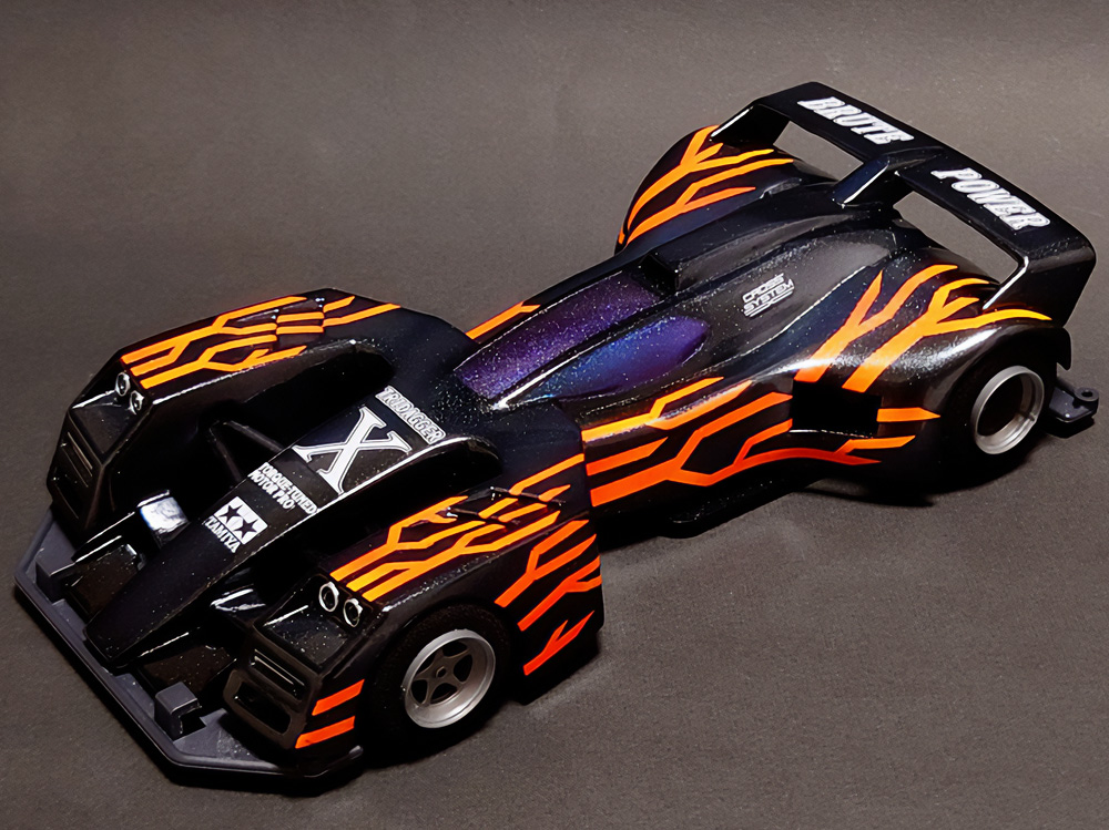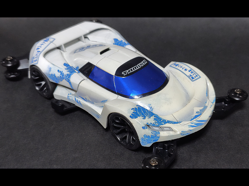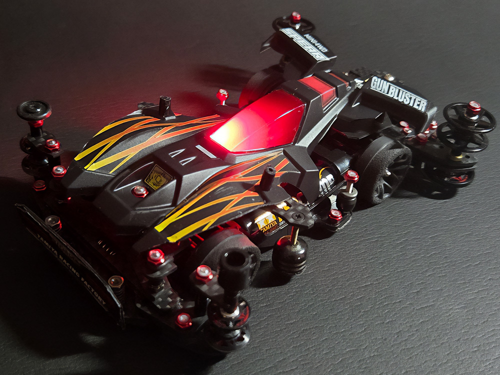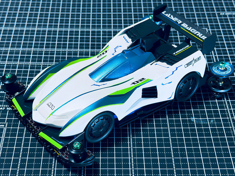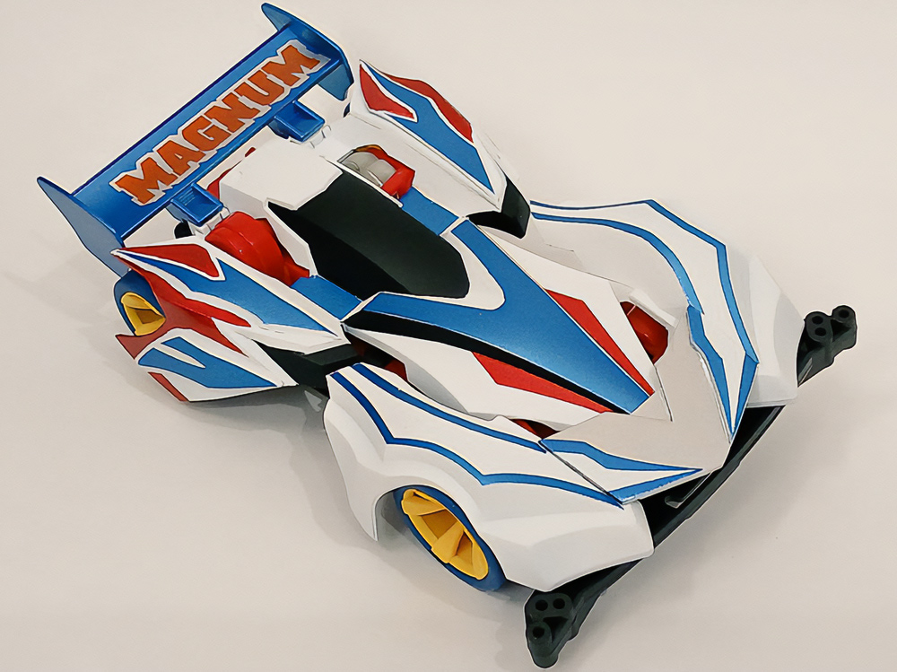 「豪」の文字を内側から光らせるための緻密な肉抜きに驚きました。一切の妥協のない作り込みに圧倒されます。写真からも伝わる重厚感に加え、写真では見えない角度からも眺めてみたくなる完成度。オリジナル「マグナム」の持つ魅力を損なうことなく、新しい解釈と現代的な造形センスを融合させたデザイン。まさに、フルカウルミニ四駆のカッコよさを極限まで引き出した傑作です!