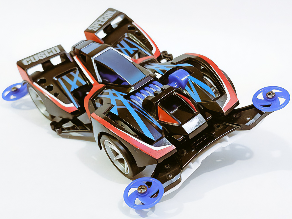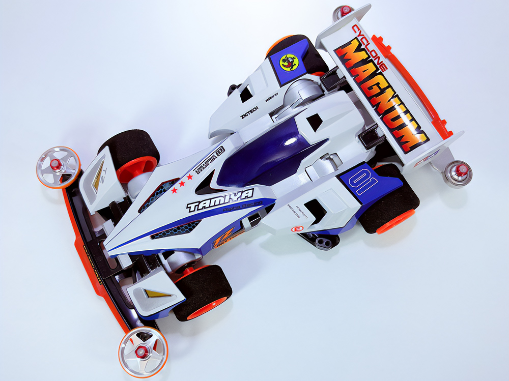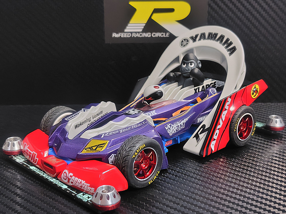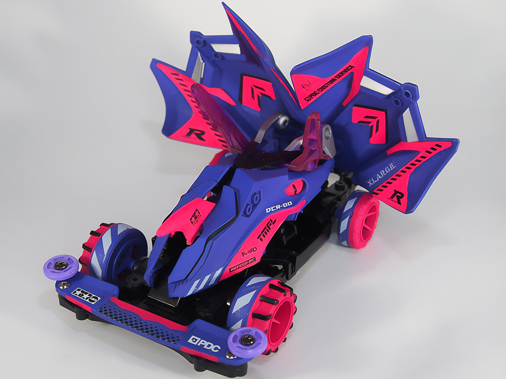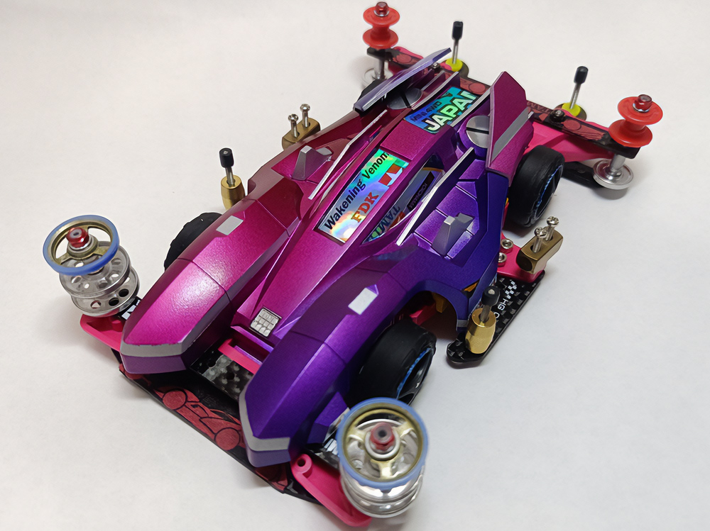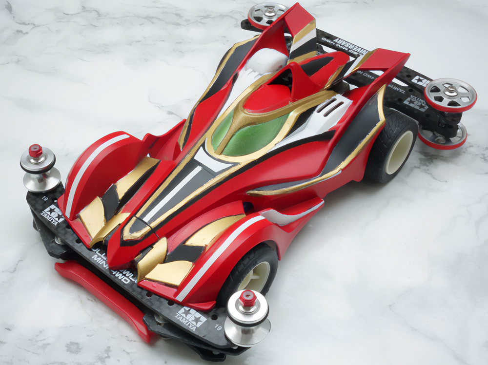 「豪」の文字を内側から光らせるための緻密な肉抜きに驚きました。一切の妥協のない作り込みに圧倒されます。写真からも伝わる重厚感に加え、写真では見えない角度からも眺めてみたくなる完成度。オリジナル「マグナム」の持つ魅力を損なうことなく、新しい解釈と現代的な造形センスを融合させたデザイン。まさに、フルカウルミニ四駆のカッコよさを極限まで引き出した傑作です!