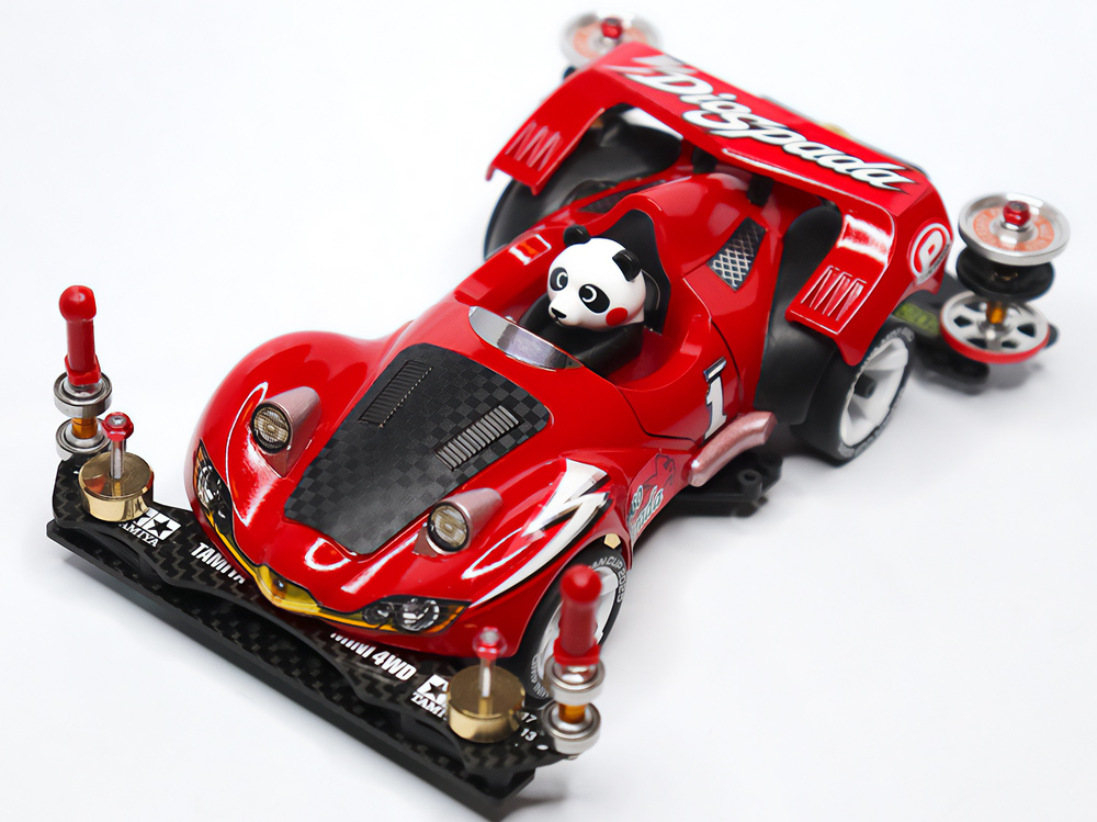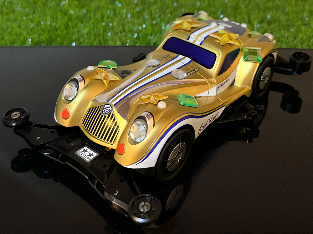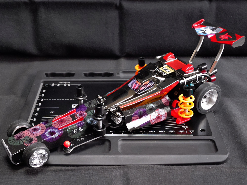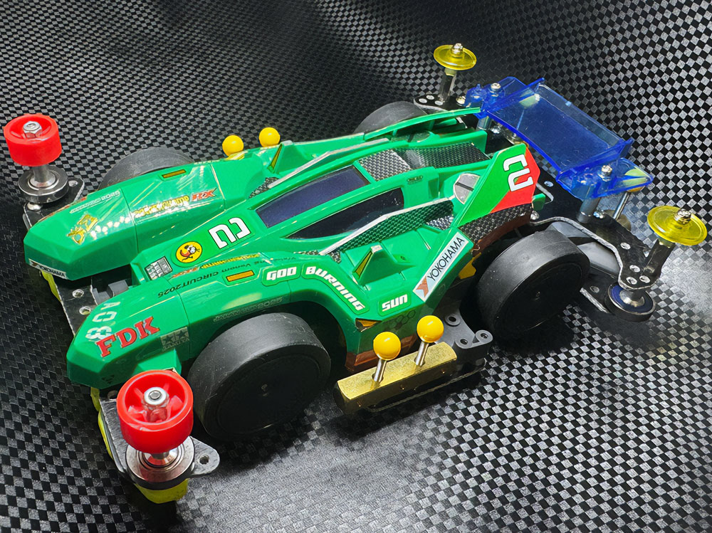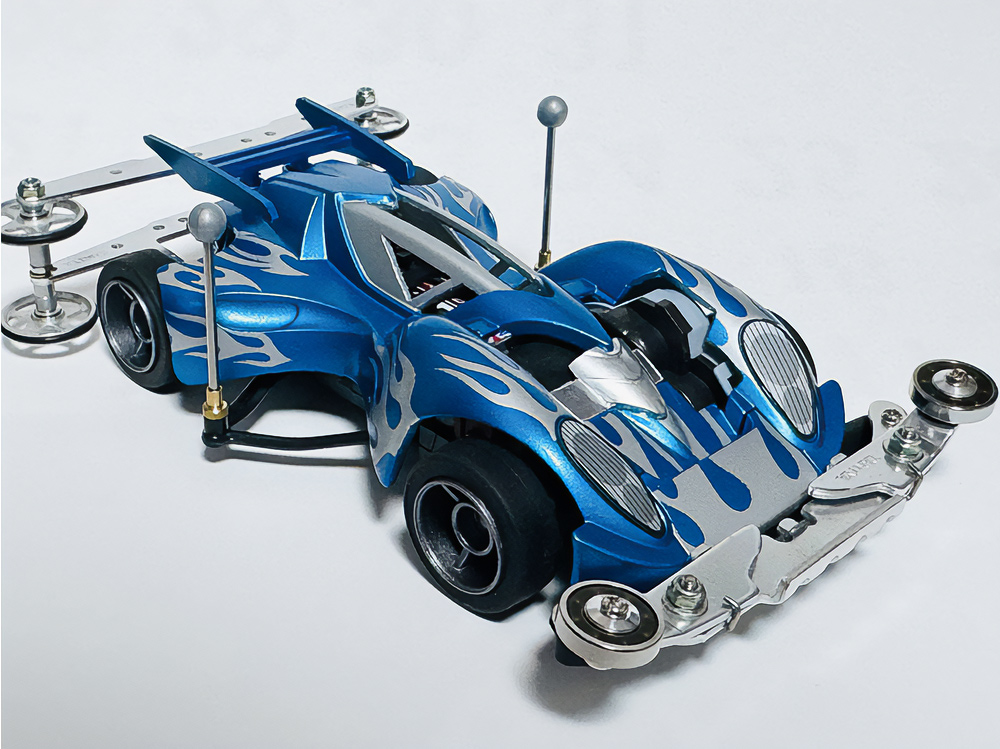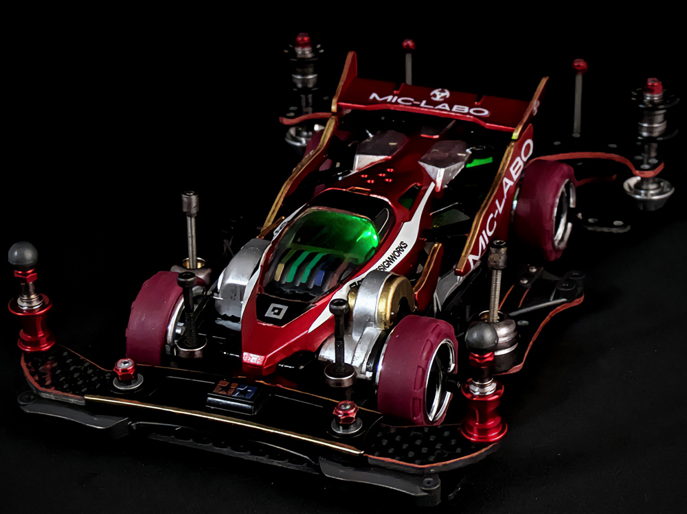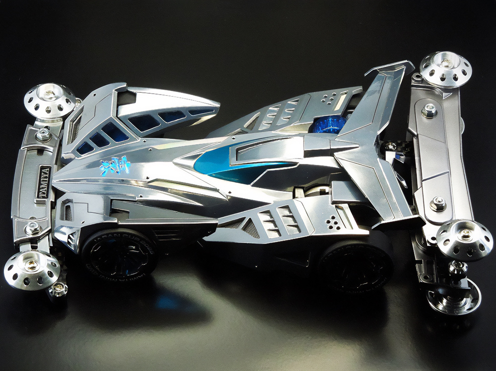 少年時代の思いを表現した夢のある作品です。ボディパーツだけでなくホイールまで金属感が溢れています。どれが金属パーツなのか、どれが元プラパーツなのか見分けるのが難しいっ。フロントのスライドダンパーのTAMIYAの彫刻もまるで金属削り出し。現代のミニ四駆の数十年後も、ぜひ思い描いてみてください! -
