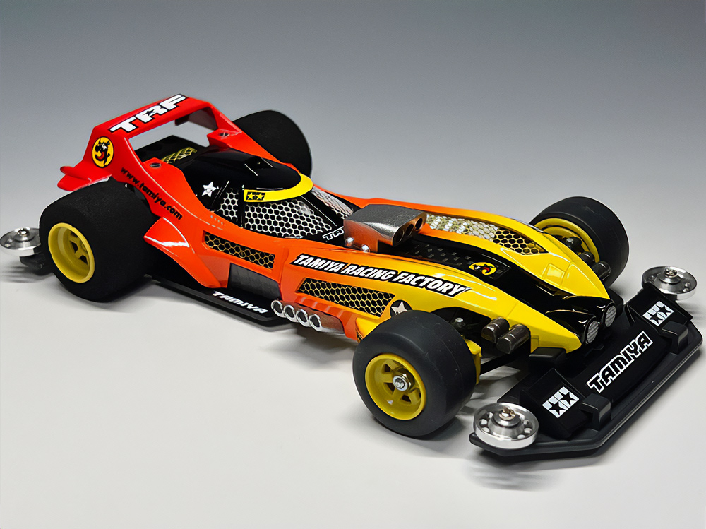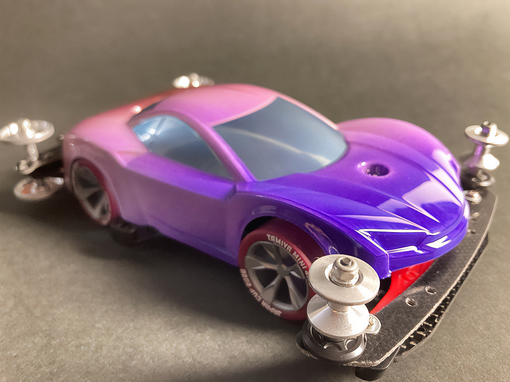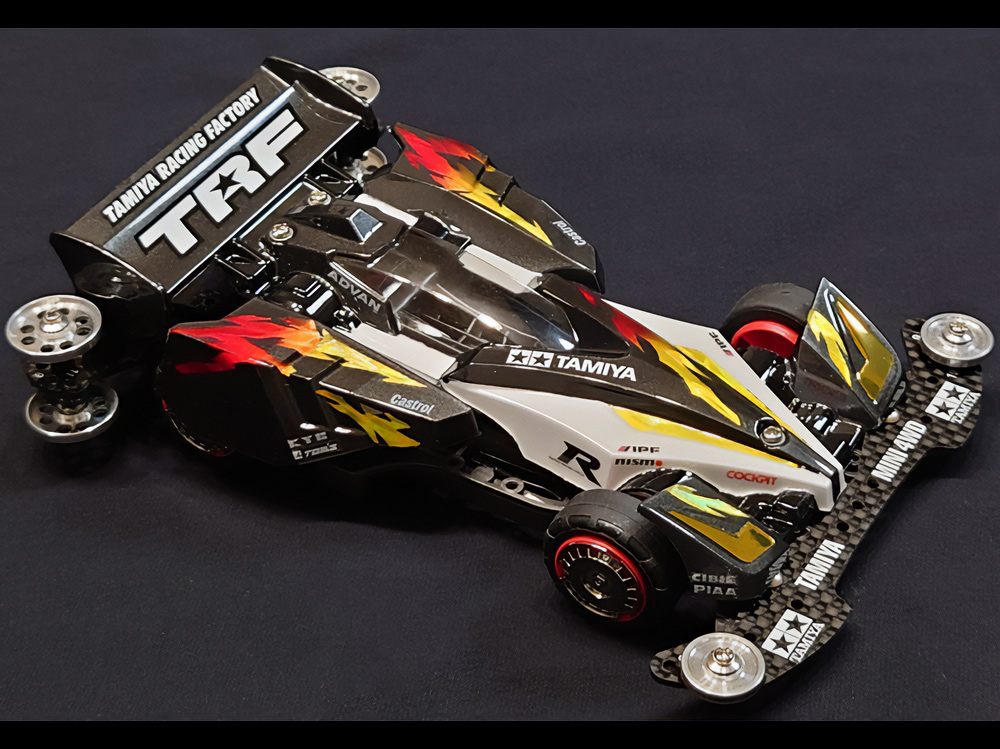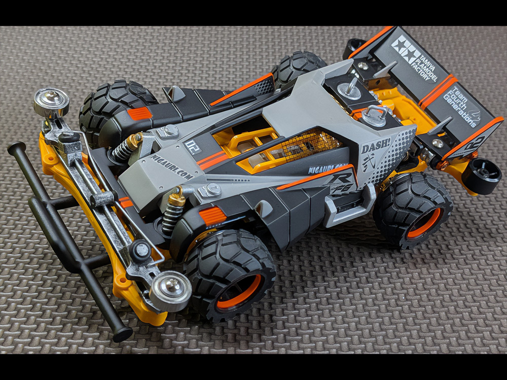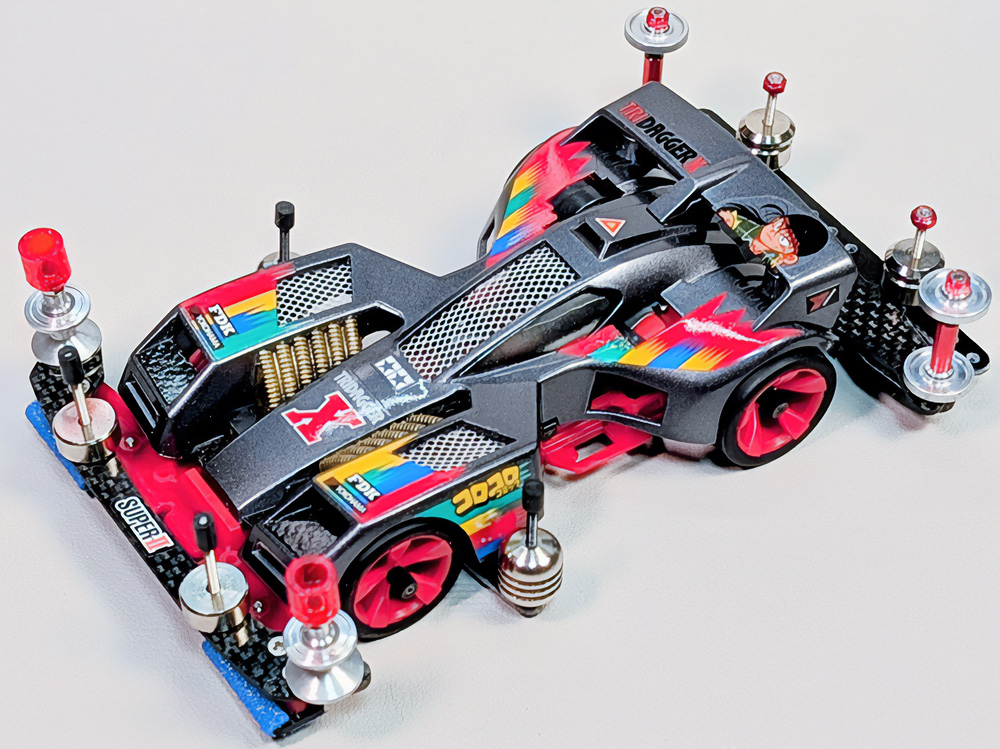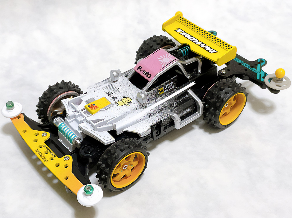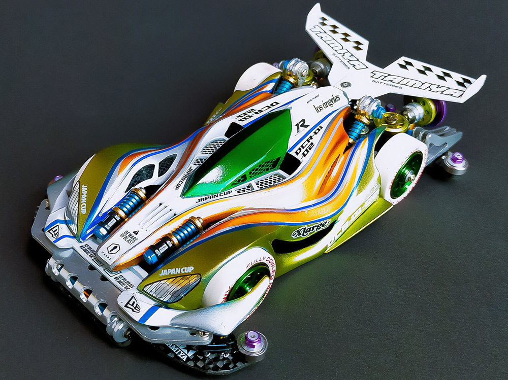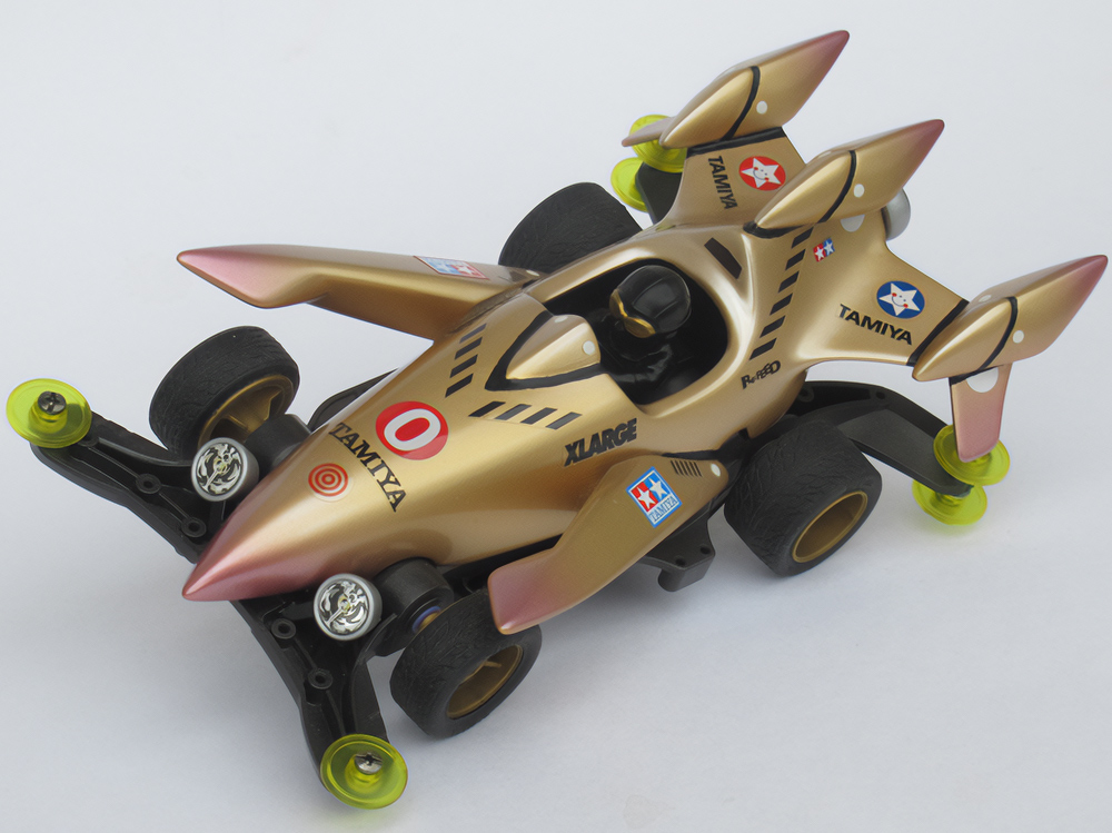 少年時代の思いを表現した夢のある作品です。ボディパーツだけでなくホイールまで金属感が溢れています。どれが金属パーツなのか、どれが元プラパーツなのか見分けるのが難しいっ。フロントのスライドダンパーのTAMIYAの彫刻もまるで金属削り出し。現代のミニ四駆の数十年後も、ぜひ思い描いてみてください! -