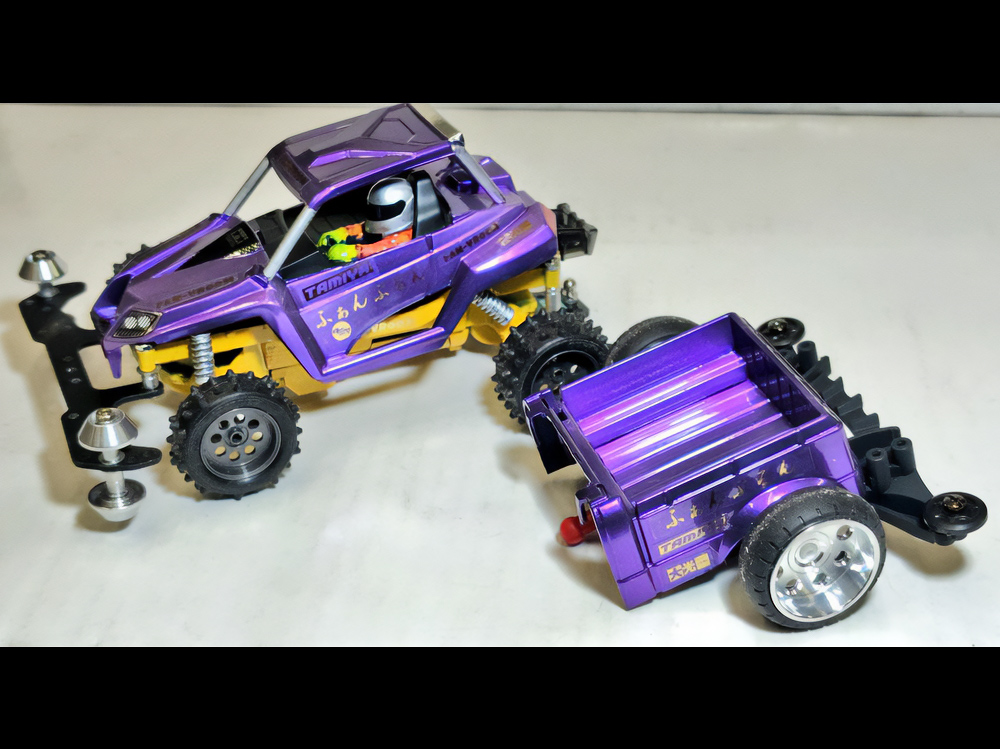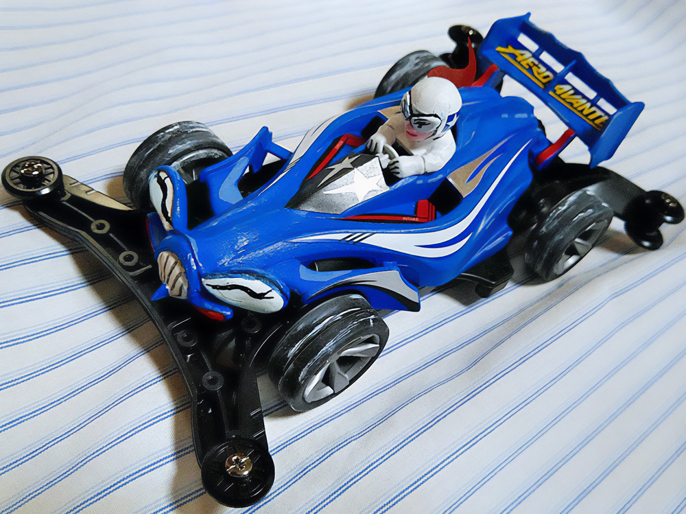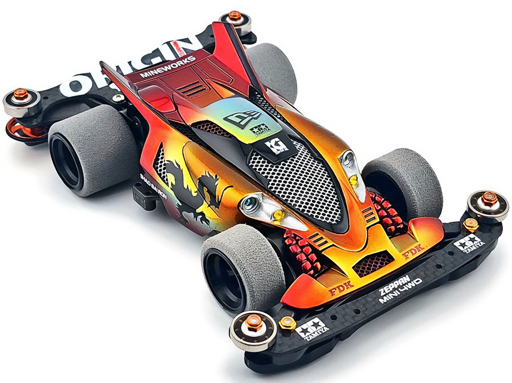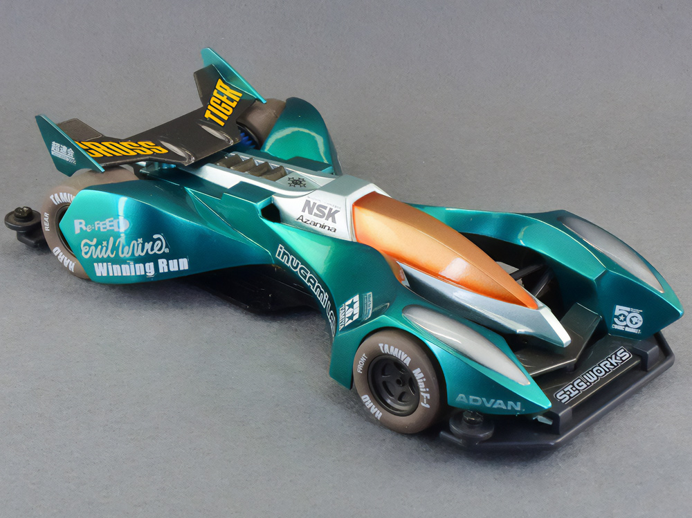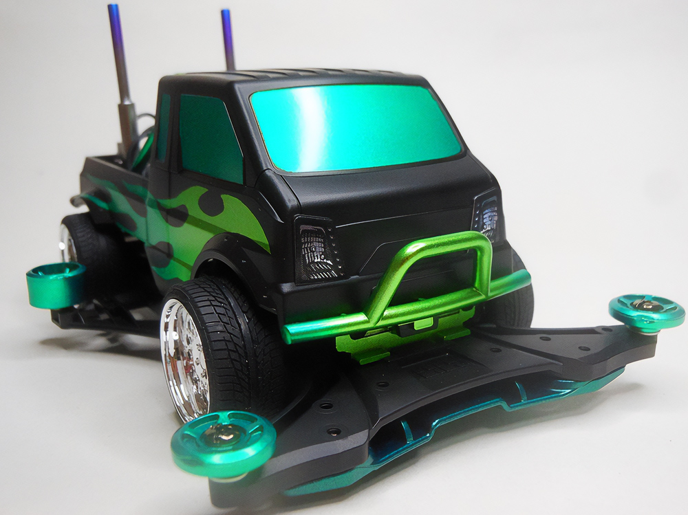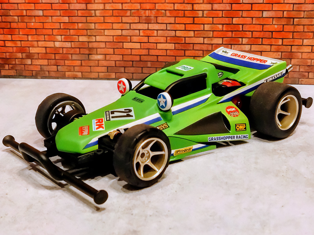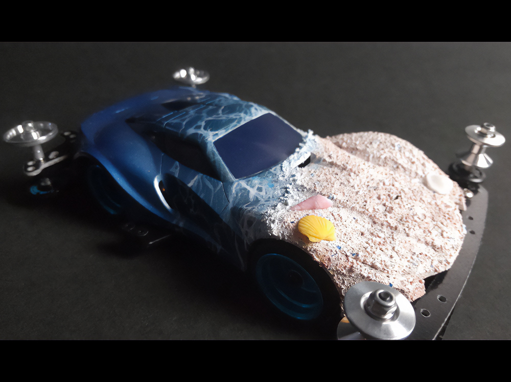 少年時代の思いを表現した夢のある作品です。ボディパーツだけでなくホイールまで金属感が溢れています。どれが金属パーツなのか、どれが元プラパーツなのか見分けるのが難しいっ。フロントのスライドダンパーのTAMIYAの彫刻もまるで金属削り出し。現代のミニ四駆の数十年後も、ぜひ思い描いてみてください! -