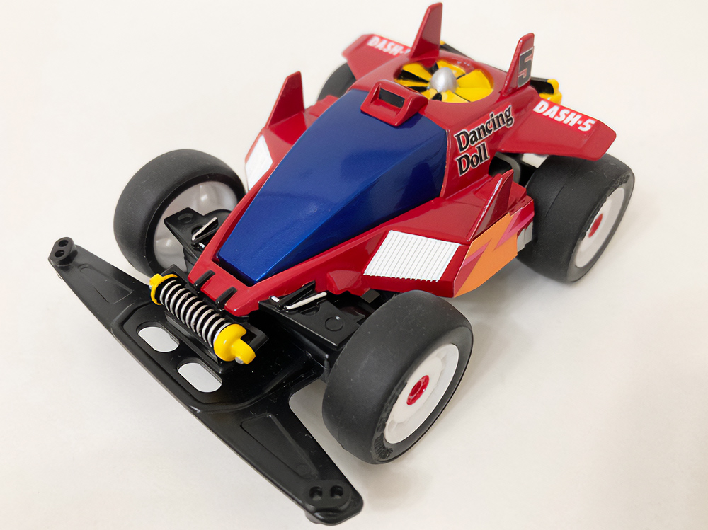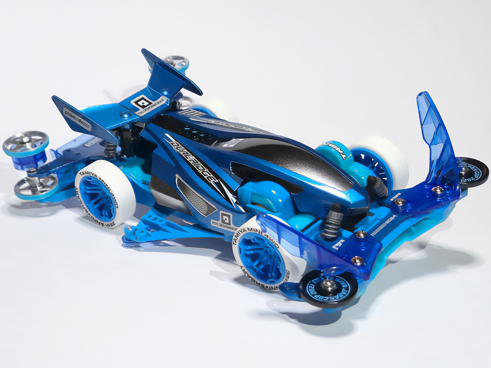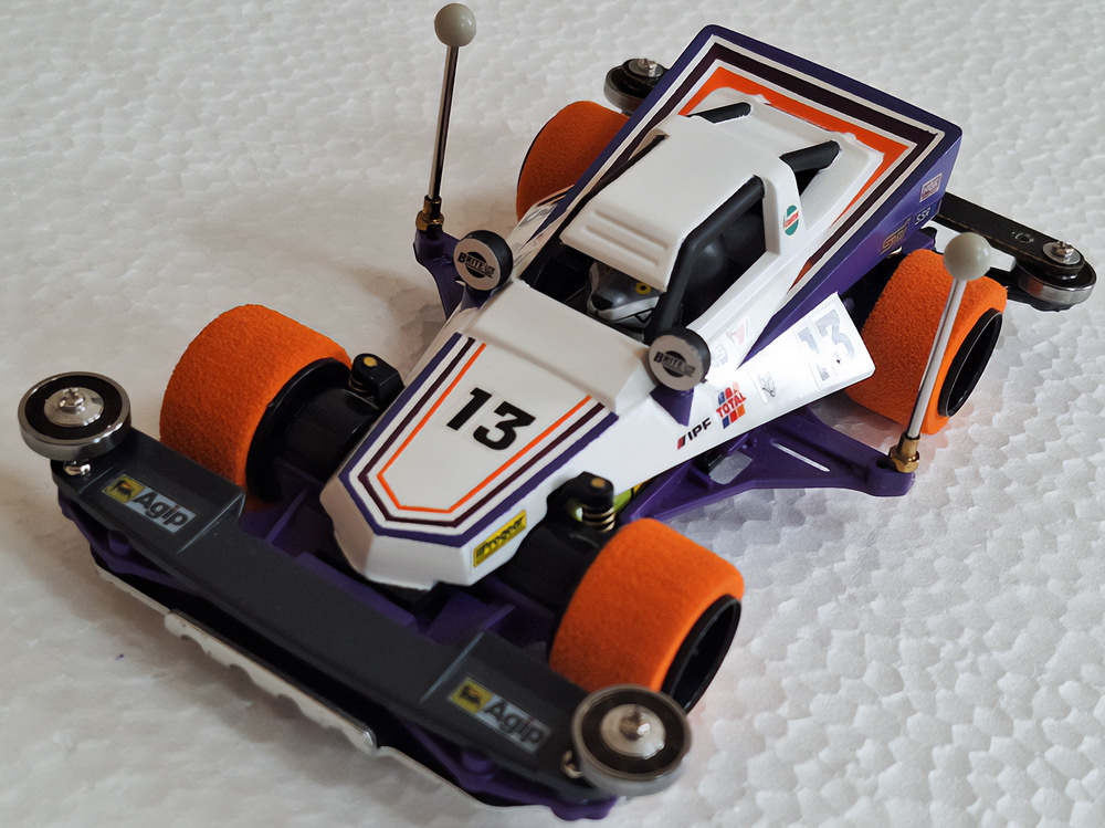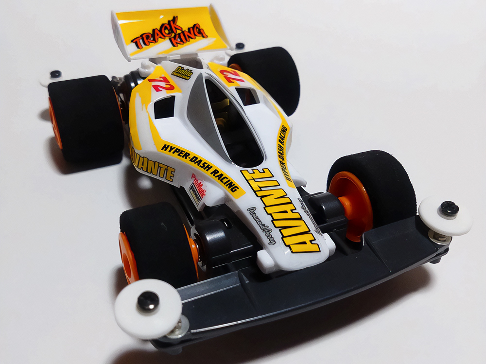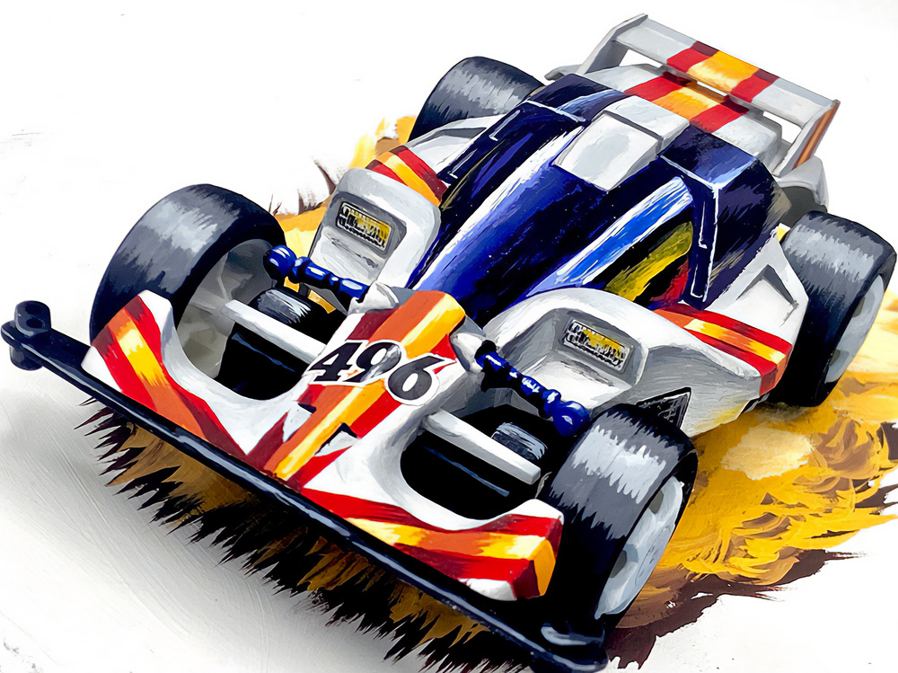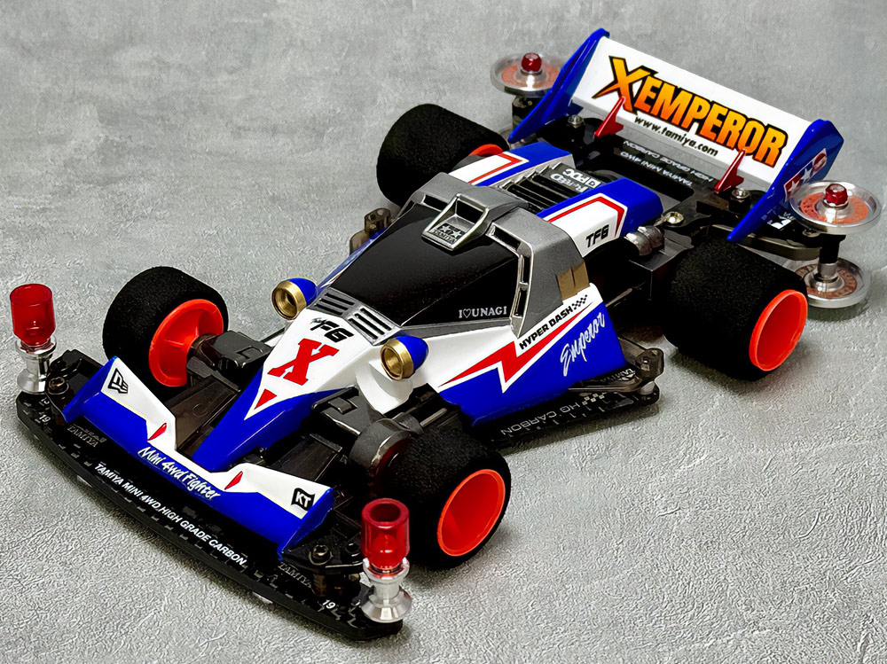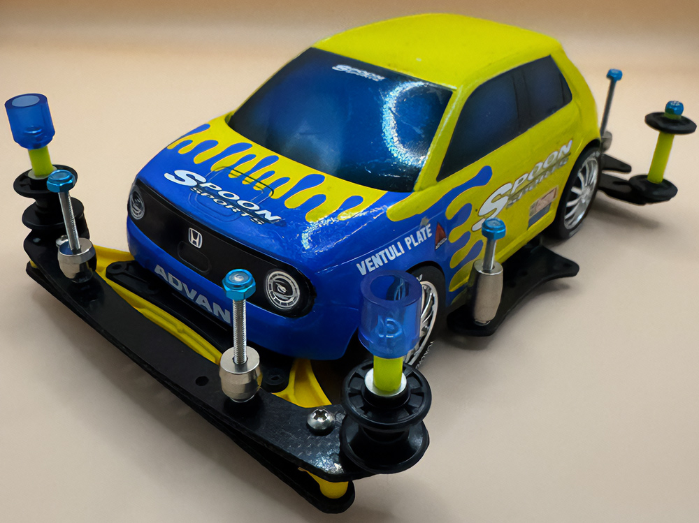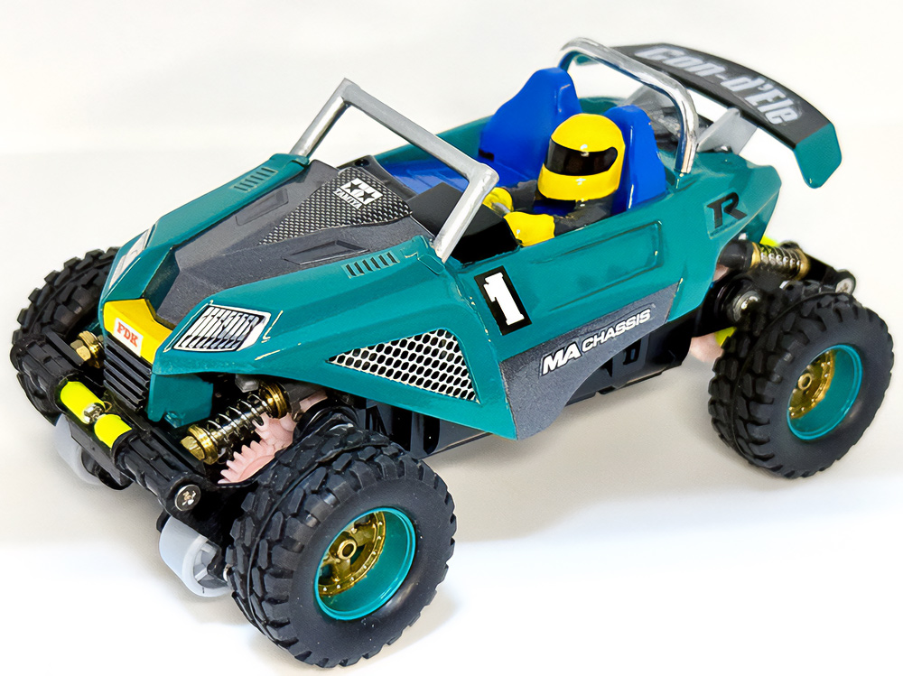 少年時代の思いを表現した夢のある作品です。ボディパーツだけでなくホイールまで金属感が溢れています。どれが金属パーツなのか、どれが元プラパーツなのか見分けるのが難しいっ。フロントのスライドダンパーのTAMIYAの彫刻もまるで金属削り出し。現代のミニ四駆の数十年後も、ぜひ思い描いてみてください! -