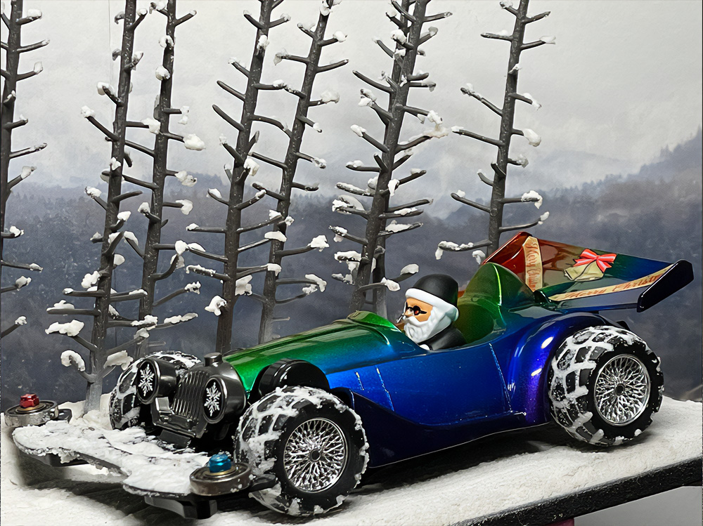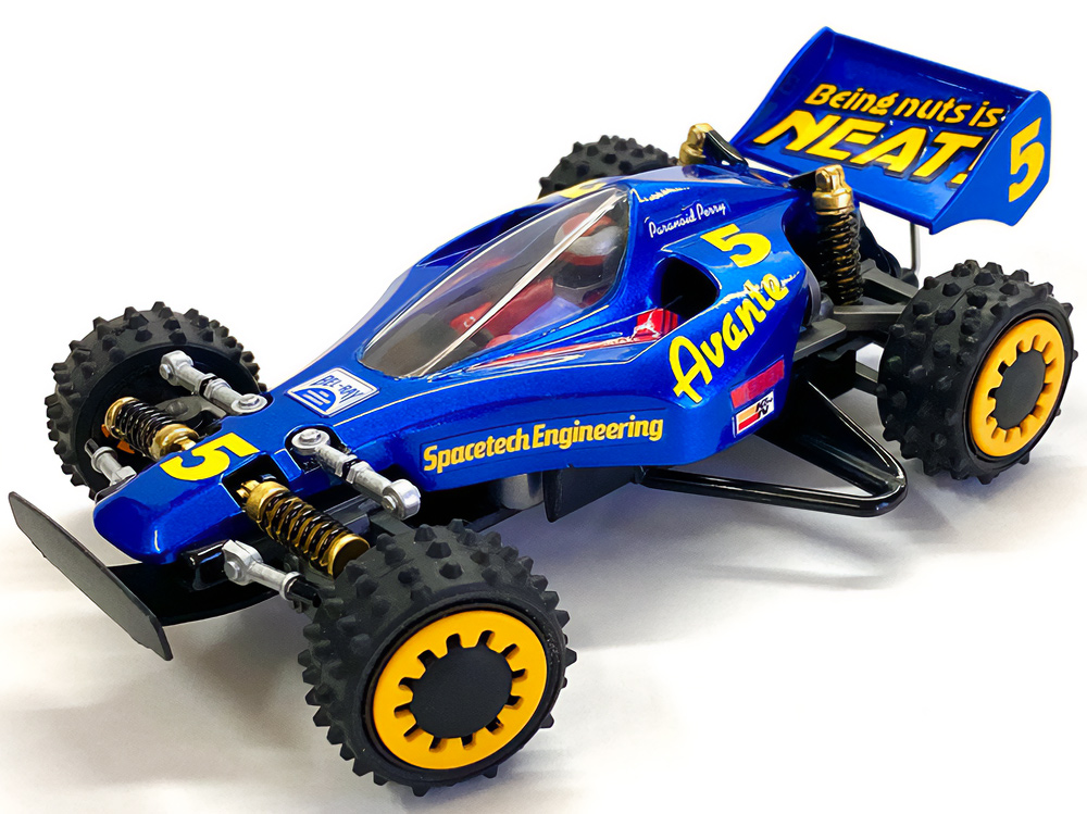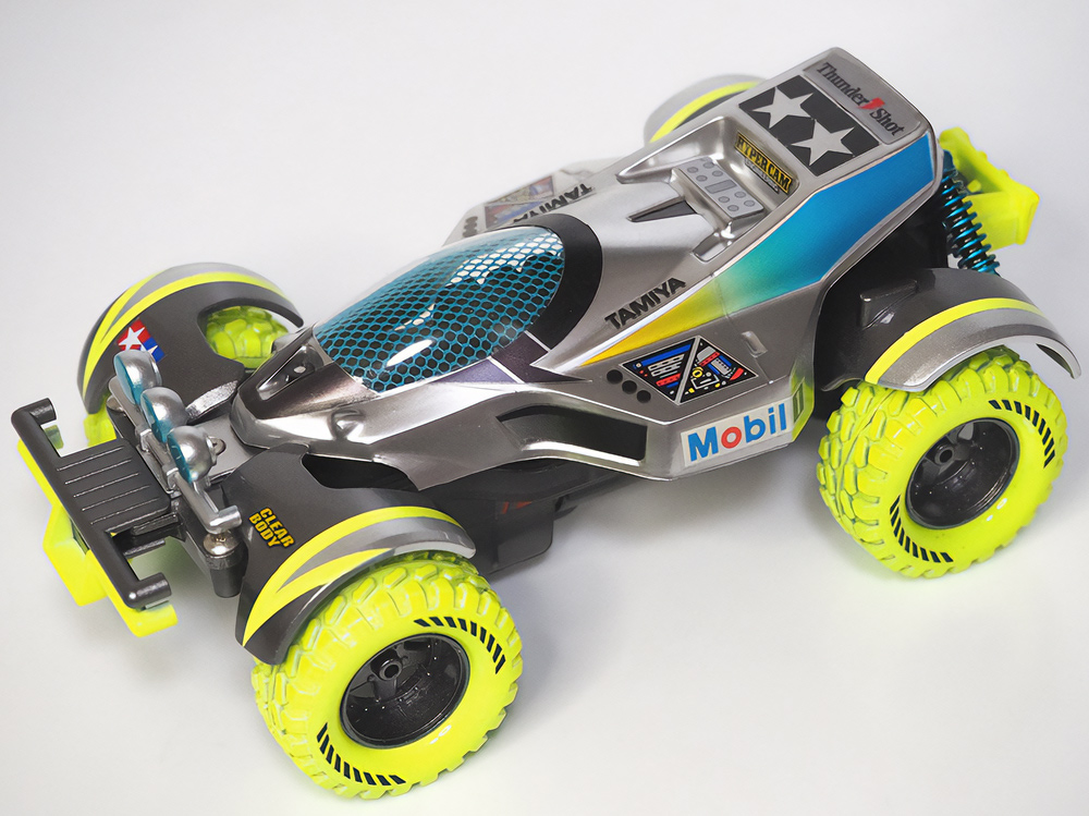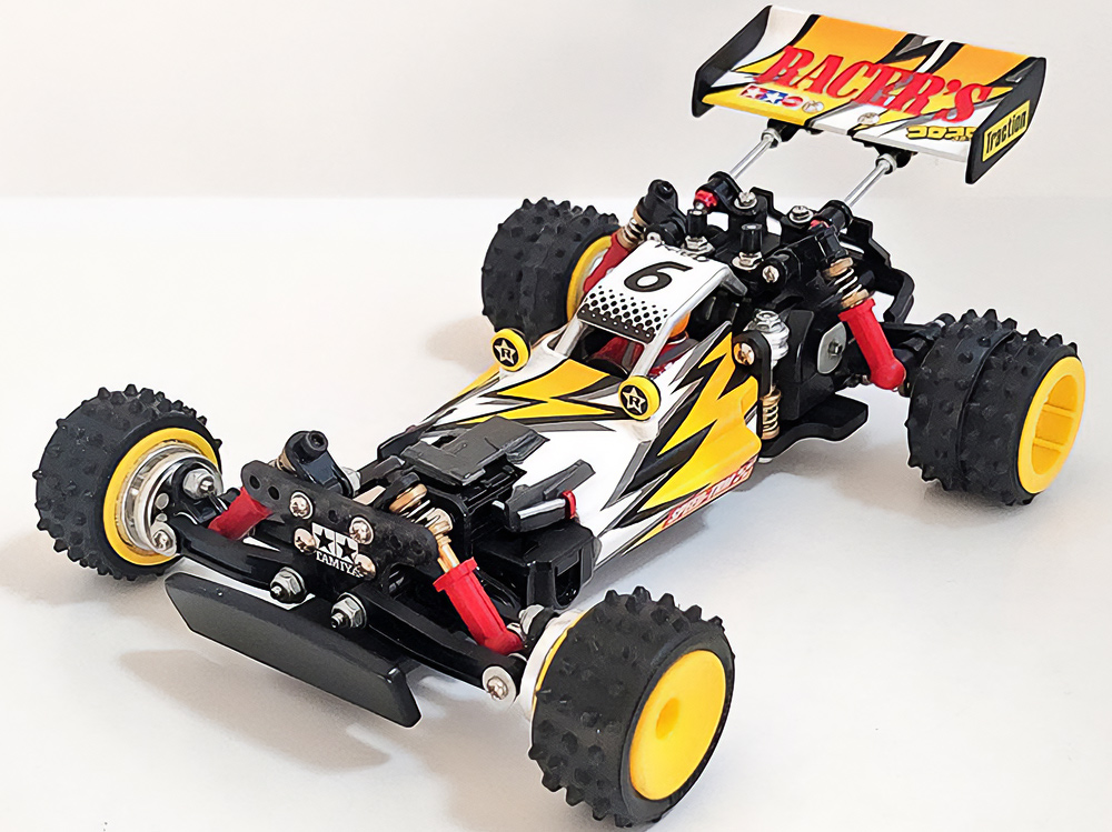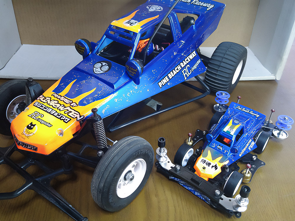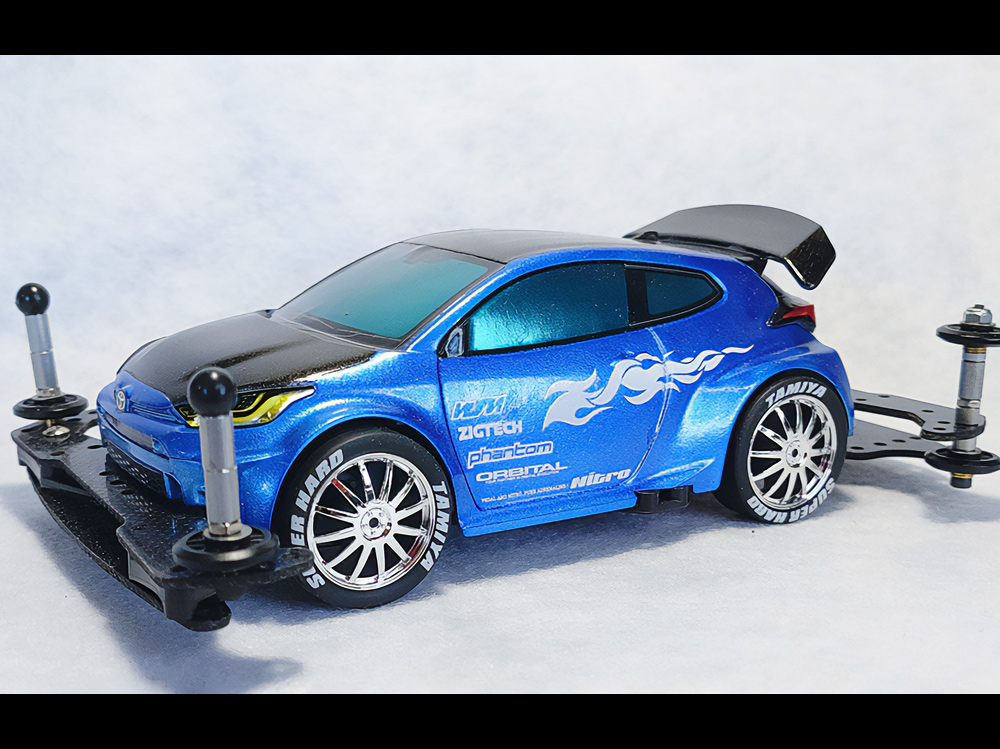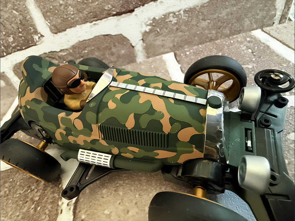 少年時代の思いを表現した夢のある作品です。ボディパーツだけでなくホイールまで金属感が溢れています。どれが金属パーツなのか、どれが元プラパーツなのか見分けるのが難しいっ。フロントのスライドダンパーのTAMIYAの彫刻もまるで金属削り出し。現代のミニ四駆の数十年後も、ぜひ思い描いてみてください! -