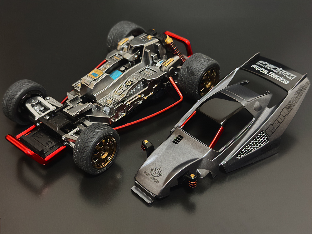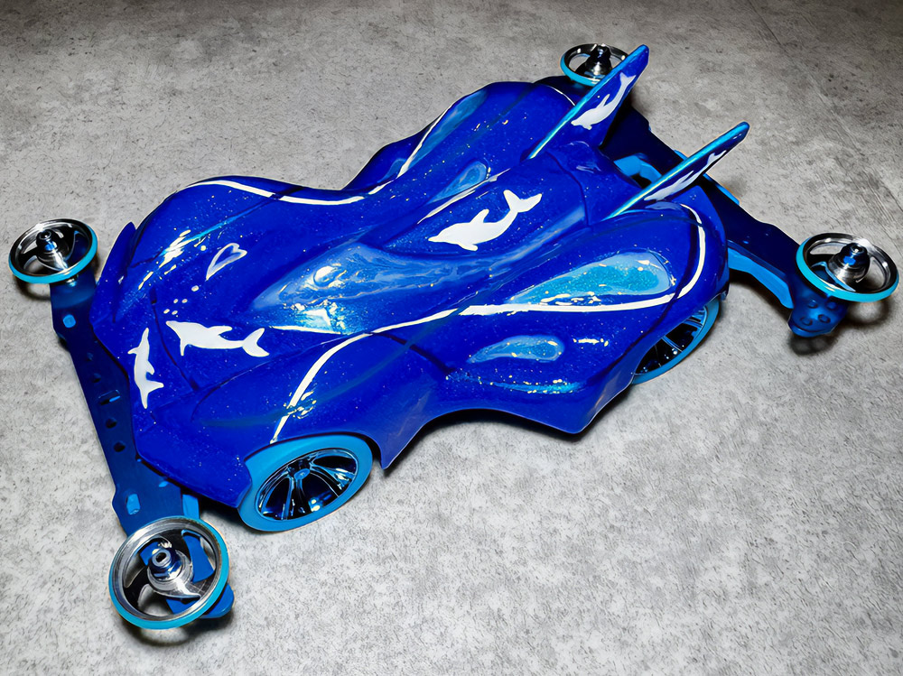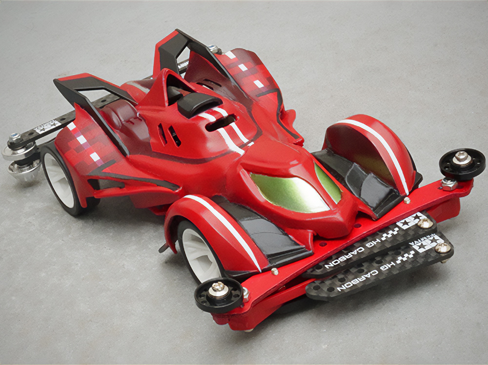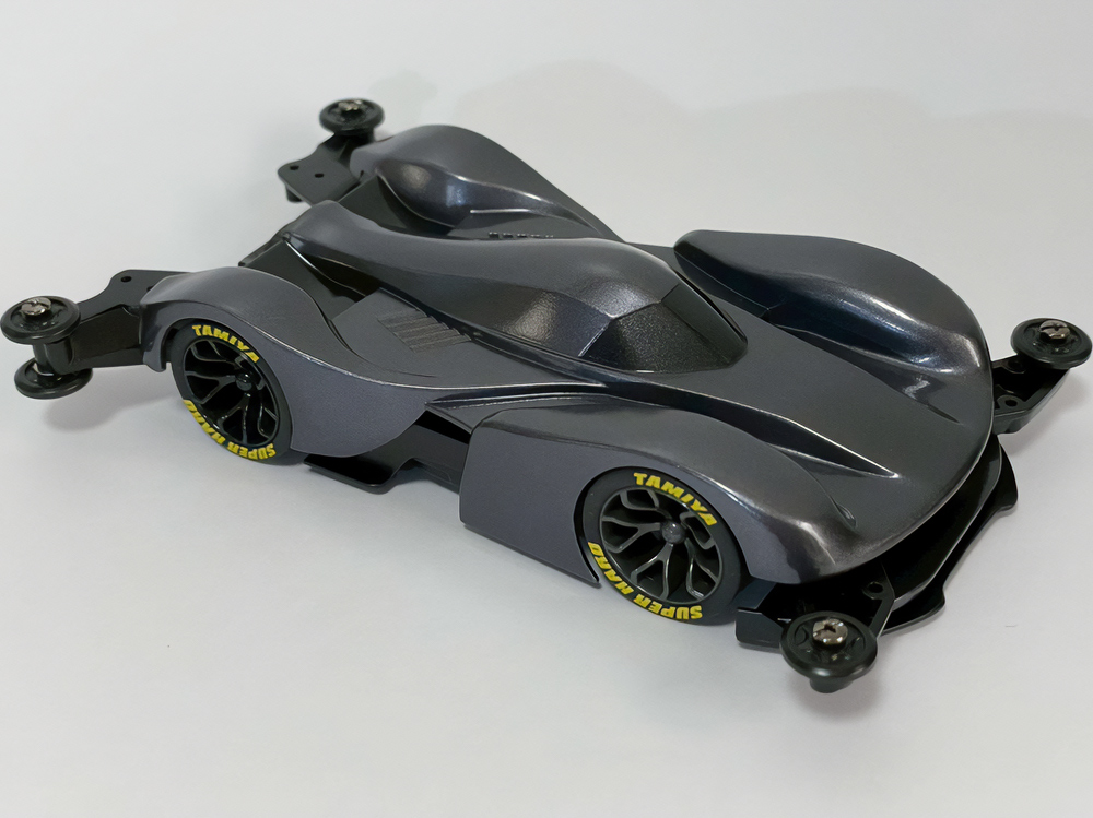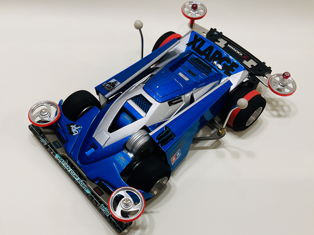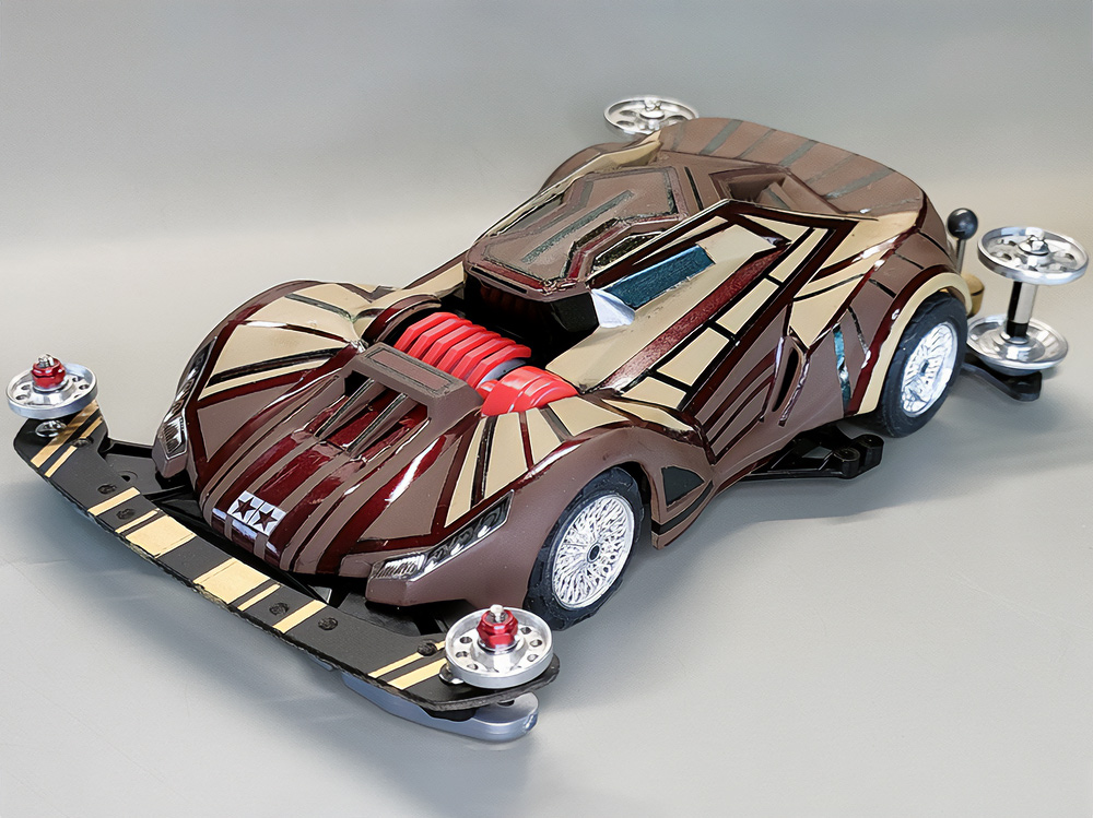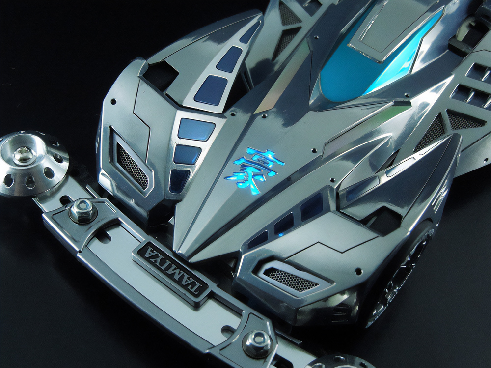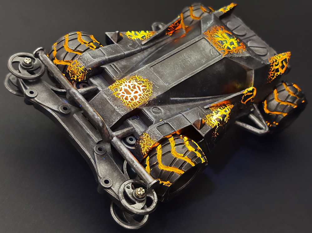 「2024年の6月にショップのミニ四駆売り場で、今回の作品でも3セット使用している HG 軽量19mmオールアルミベアリングローラー(テーパータイプ)というパーツを手に取った瞬間に、その独特な形状に近未来感を覚えたのがきっかけでした。少年時代は映画のロボコップやターミネーター等の影響でメカニカルな物に憧れていて、未来の世界はきっとこういうもので溢れているのだろう…もちろんミニ四駆もメカニカルな姿になっているのだろうと考えていました。当時、漠然と思い描いていた"ピカピカに光り輝いた、まるで機械のようなミニ四駆"という未来のミニ四駆のイメージを今現在のセンスでブラッシュアップして具現化しました。」