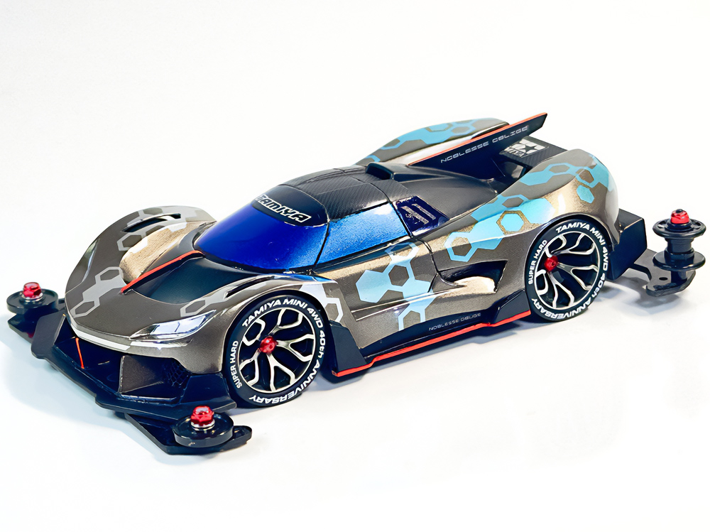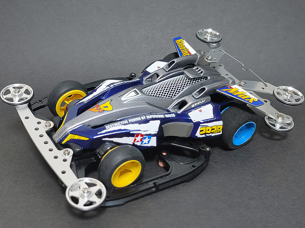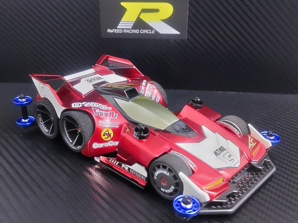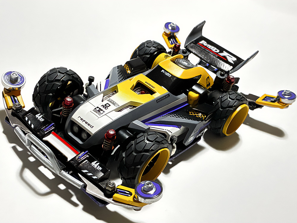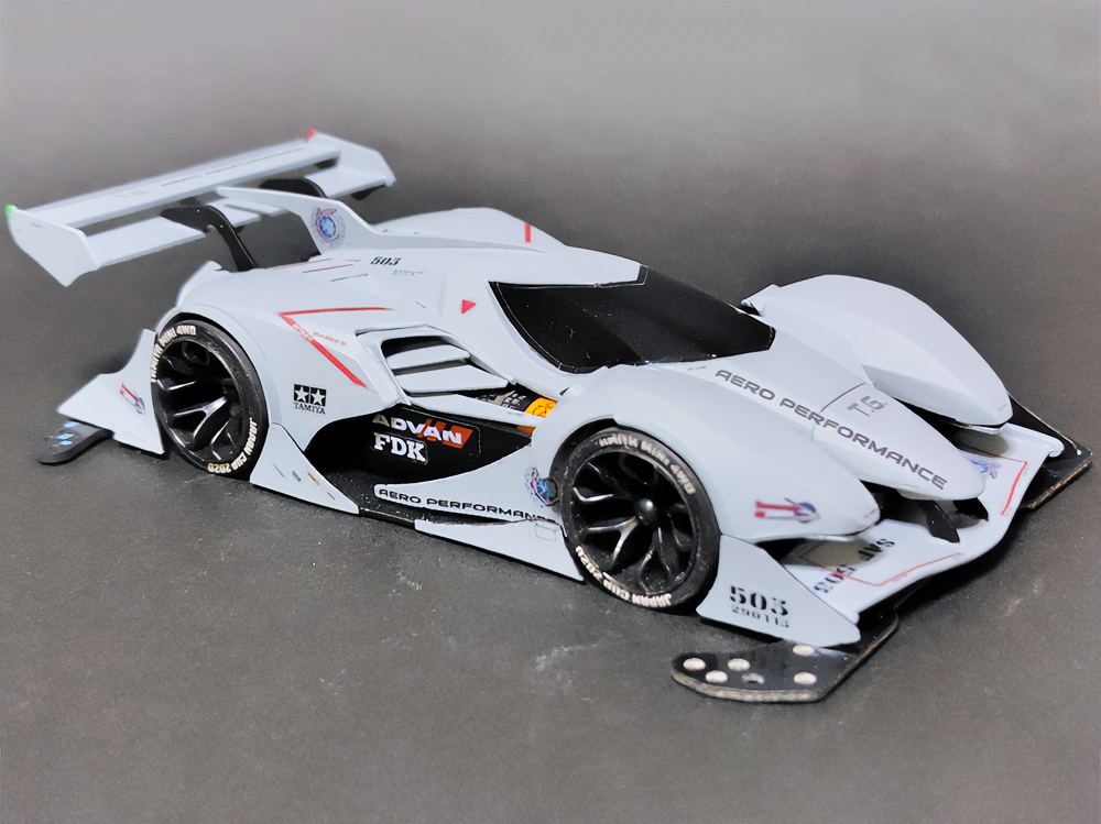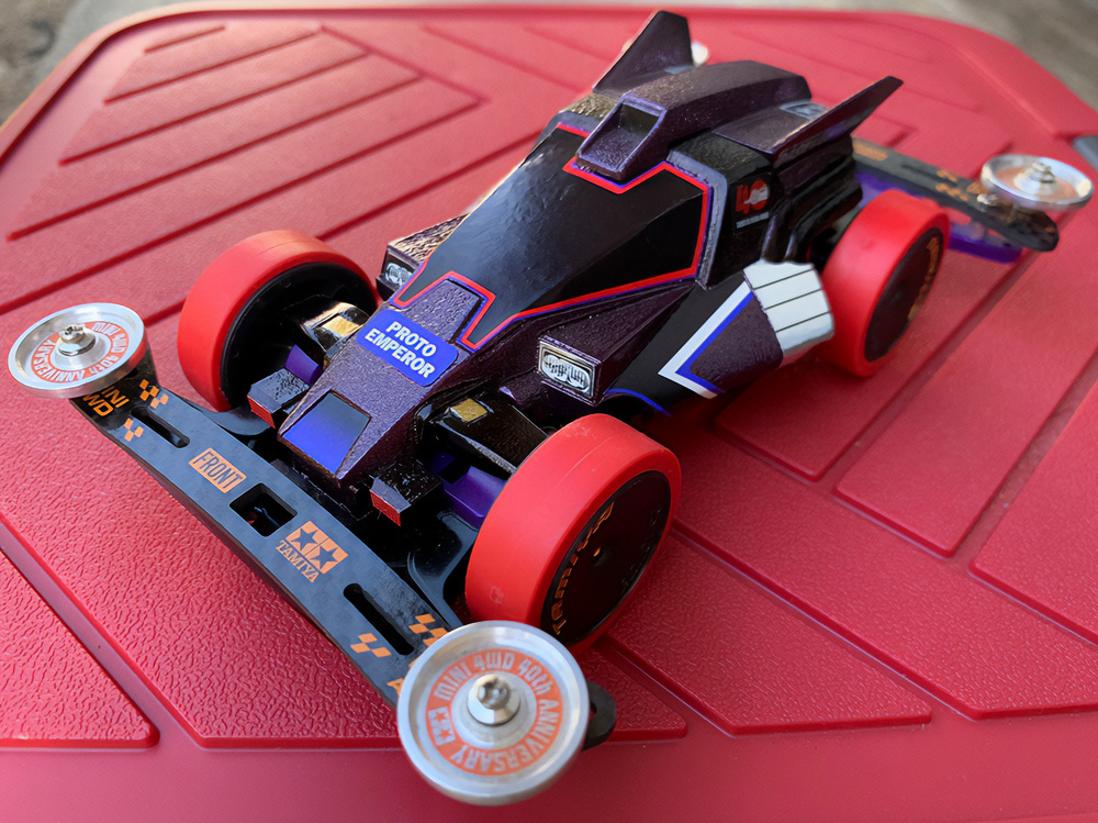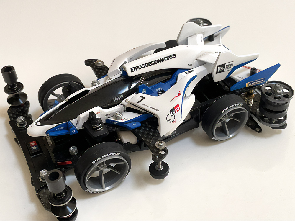 「2024年の6月にショップのミニ四駆売り場で、今回の作品でも3セット使用している HG 軽量19mmオールアルミベアリングローラー(テーパータイプ)というパーツを手に取った瞬間に、その独特な形状に近未来感を覚えたのがきっかけでした。少年時代は映画のロボコップやターミネーター等の影響でメカニカルな物に憧れていて、未来の世界はきっとこういうもので溢れているのだろう…もちろんミニ四駆もメカニカルな姿になっているのだろうと考えていました。当時、漠然と思い描いていた"ピカピカに光り輝いた、まるで機械のようなミニ四駆"という未来のミニ四駆のイメージを今現在のセンスでブラッシュアップして具現化しました。」