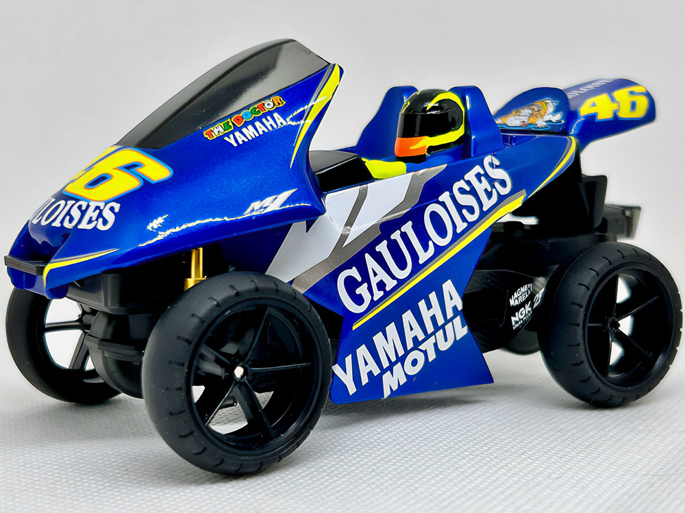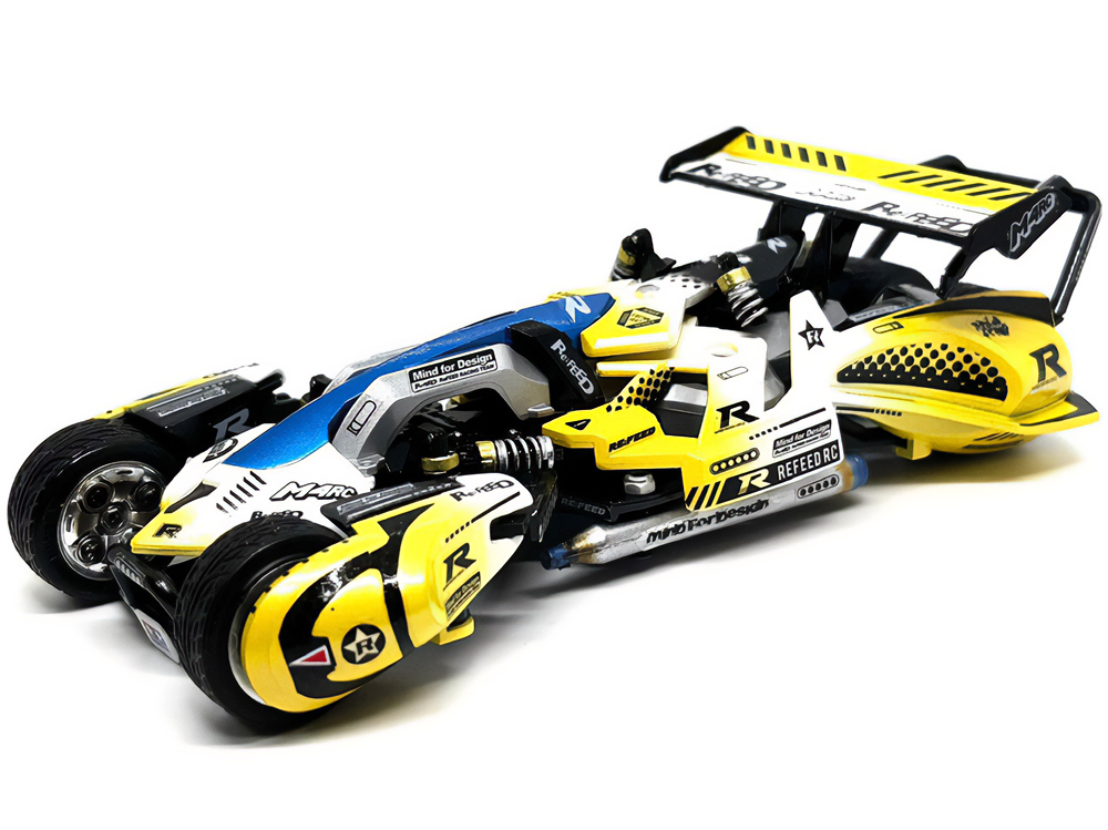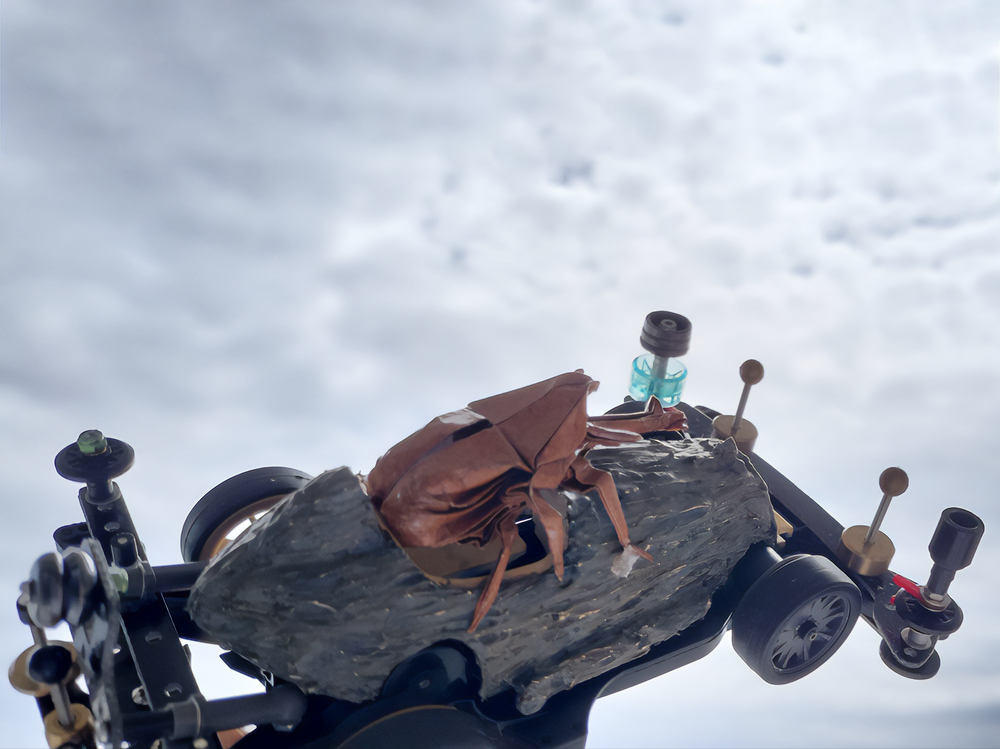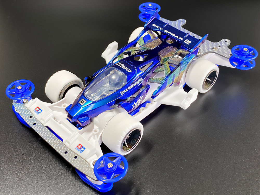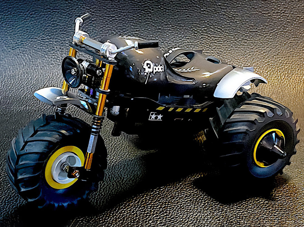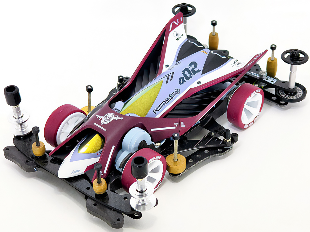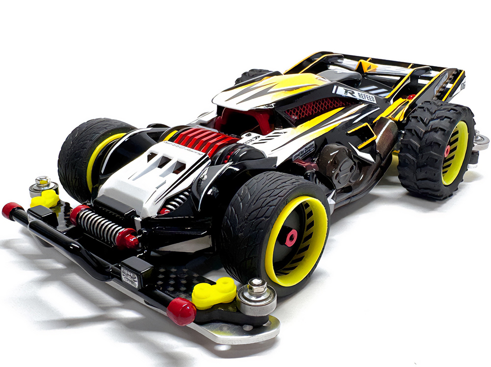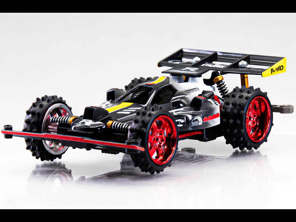 「2024年の6月にショップのミニ四駆売り場で、今回の作品でも3セット使用している HG 軽量19mmオールアルミベアリングローラー(テーパータイプ)というパーツを手に取った瞬間に、その独特な形状に近未来感を覚えたのがきっかけでした。少年時代は映画のロボコップやターミネーター等の影響でメカニカルな物に憧れていて、未来の世界はきっとこういうもので溢れているのだろう…もちろんミニ四駆もメカニカルな姿になっているのだろうと考えていました。当時、漠然と思い描いていた"ピカピカに光り輝いた、まるで機械のようなミニ四駆"という未来のミニ四駆のイメージを今現在のセンスでブラッシュアップして具現化しました。」