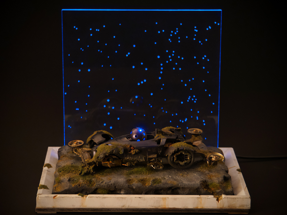 「100円均一で購入した乳白色の収納用プラBOX内に作品を置いて、同じく100円均一のLEDライトで照らして10年以上前のコンデジで撮影してます。光量が足りない時はデスクライトを追加したりしますが、今回の作品は光をよく反射するので、照らす光量は控えめにして、陰影で金属感を強調出来るように工夫しました。構図はいつもパッケージアートを参考にしています。」