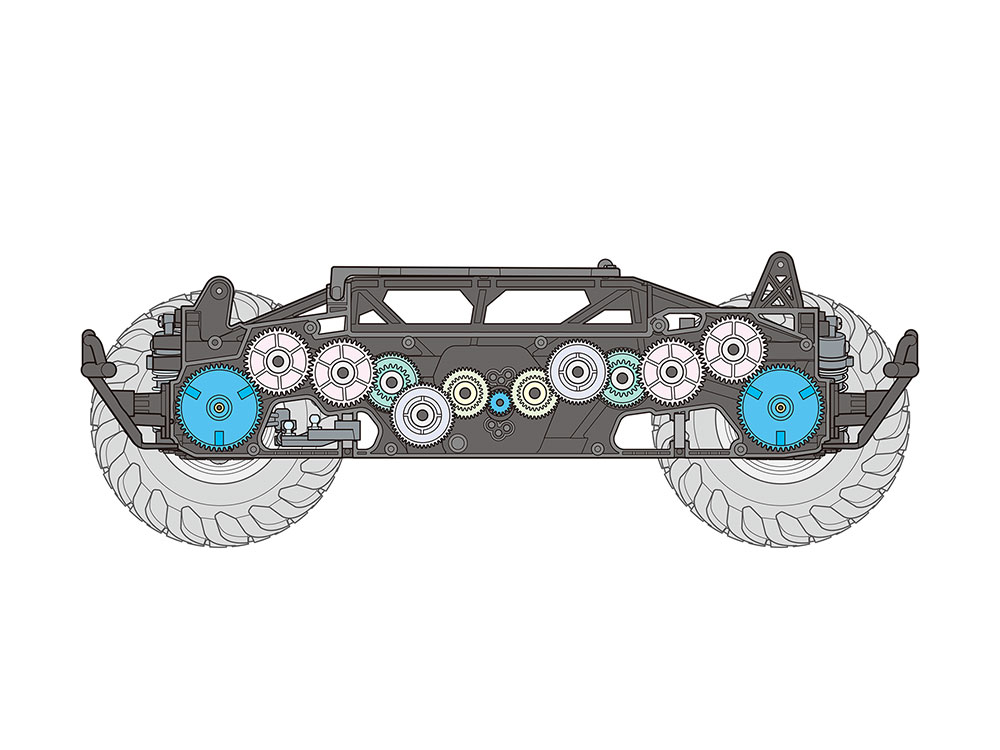【 タフ&スリムが特徴のギヤドライブ4WD、GF-02シャーシ 】 軽く強度のあるモノコックフレーム中央の低い位置にモーターを搭載して、ギヤで前後輪にパワーを伝達するギヤドライブ4WDを採用したのがGF-02シャーシ。ロングホイールベース・ワイドトレッドの車体構成により安定したオフロード走行が楽しめます。フレームはラダー/パイプをイメージさせるスリムで立体的な造形が特徴。ギヤケースはフレーム一体型として、小石などの侵入を防ぐ密閉式。前後にデフギヤを内蔵してスムーズなコーナリングを生み出します。さらに、別売のピニオンギヤを用意すれば3種類のギヤ比が選択でき、モーターガードを装備してオフロード走行時の信頼性も十分です。サスペンションはダブルウィッシュボーン4輪独立。前後に合計4本のフリクションダンパーをセットして、等長2分割タイロッドによりクセのない操縦特性を発揮。色鮮やかな蛍光イエローのディープリム・ワンピースホイールには直径123mmの中空ゴム製大径タイヤを装着しました。
