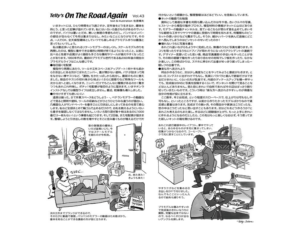 模型作りのための様々な情報を満載したタミヤニュース11月号が発刊です。さて、今月のタミヤニュースはまず、「模型ファンをたずねて」にVFX(視覚効果)ディレクターとして活躍する渋谷紀世子さんが登場。数々のヒット映画でその手腕を発揮してきた渋谷さん。映画の道に踏み出すきっかけには、ミニチュア製作への憧れがありました。斎木伸生さんの「戦跡をたずねて」は、1939年の冬戦争でフィンランド軍とソ連軍が激戦を繰り広げたクフモが舞台。レストアされた陣地跡をはじめ、現在もなお緊張感がただよう国境線など興味深い写真が満載です。また、佐原輝夫さんの「On The Road Again」は、佐原さん自身の模型ライフをイラストとともに紹介。模型用品の宅配便が毎日のように届いたり、ネットにアップされた見事な作品に気後れしたり、モデラーなら共感すること間違いなし。デスクまわりのレイアウトなども参考になります。そして、計139点の応募があった「東武タミヤモデラーズWEBコンテスト2023」の入賞作品も一挙に掲載。東武賞(情景部門)に輝いた『コラボ』をはじめ、今回はオートバイ作品の力作が目立ちました。さらに「PICK UP!」では、千葉市を拠点とするモデラーズクラブ「ミリオンウイングス」が手がけた『1/72 大日本帝国海軍 航空母艦“飛龍”Project』を紹介。空母飛龍の甲板にずらりと並べられた、プロペラを回し翼端灯を点灯させる零戦と97式艦上攻撃機。しかし配線はどこにも見当たらず?柔軟な発想と技術が生んだ驚きの作品です。新製品紹介は第1弾から実に39年ぶりの登場となった、1/35 動物セットIIをピックアップ。その他、レースレポートやイベントレポートなど盛りだくさんの内容です。