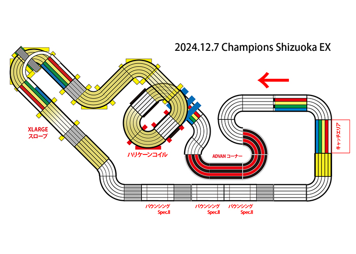 公式サーキットは「GREAT TATSUDOSHI AR CIRCUIT 2024」をベースにアレンジを加えた本大会専用サーキット。サプライズはなんといっても「走行する向きが今までと逆!」猛威を振るってきた「バウンシングストレート」が最後に待ち受ける形になります。チャンピオンズの猛者たちはどのように挑むのか!