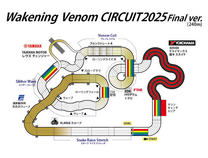 ジャパンカップ2025・公式サーキット『Wakening Venom CIRCUIT2025 Final ver.』。ウェーブセクションを多用したD.D.ウェーブは1枚追加されD.D.D.ウェーブへ進化。数々の選手を苦しめたブルンストレートは3つ山が4つ山へと新たに『ブルンストレート4』として登場。これまでの大会からさらにパワーアップした最終仕様のサーキット、各大会を制してきた優勝者たちはどのように挑むのでしょうか。