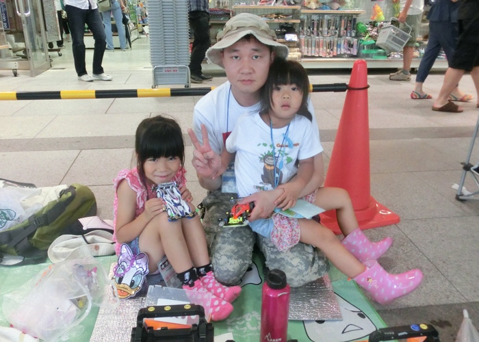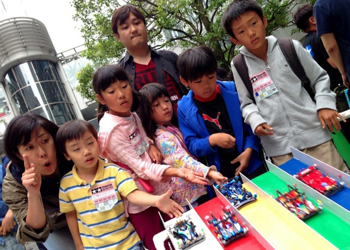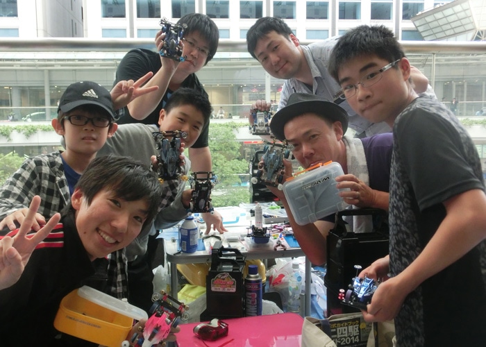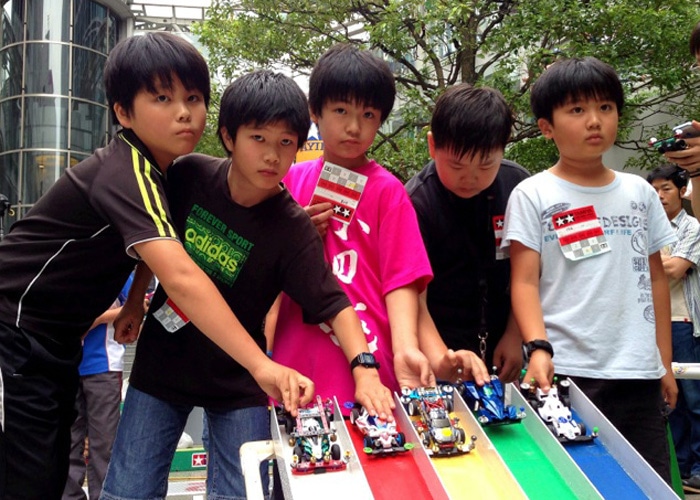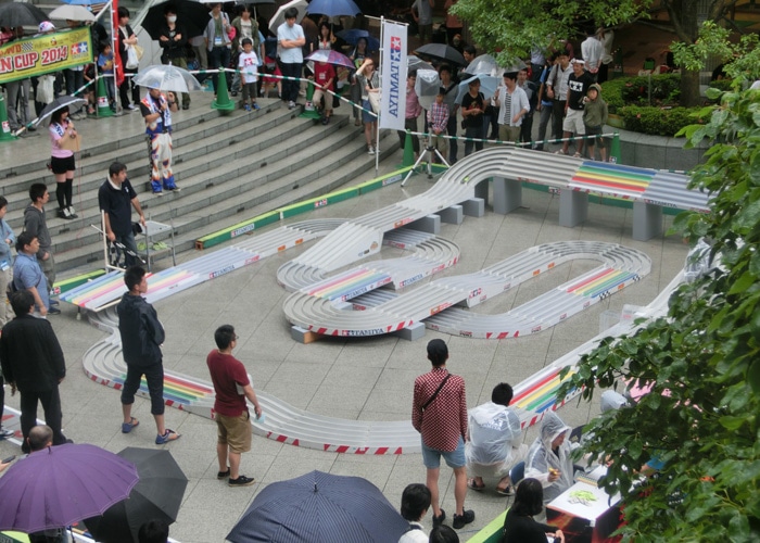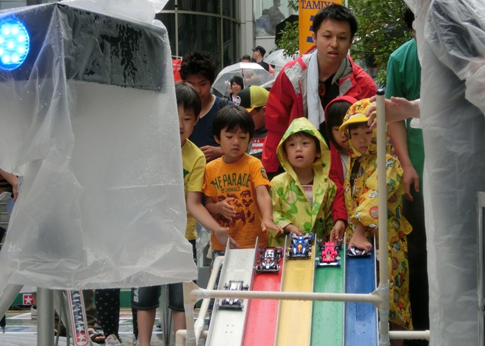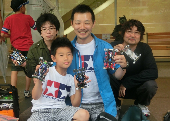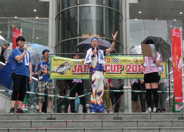 ■会場 : 品川シーサイドフォレスト・オーバルガーデン(東京都品川区) ミニ四駆日本一を決める「富士通 乾電池 提供 ミニ四駆ジャパンカップ2014」、いよいよ開幕です!全国15会場の皮切りとなった東京大会1、会場はおなじみ品川シーサイドフォレスト・オーバルガーデン。 当日は朝からあいにくの雨となりましたが、MCガッツの挨拶、前年度チャンピオンの開幕宣言、そしてMCと前チャンピオンに一般参加の中から選ばれた選手を加えた5名での始走式といったオープニングセレモニーを開催。今年もミニ四駆レーサーの暑い夏が始まりました! サーキットはかねてから発表されていた「スーパーグライドサーキット2014」。初めての走行・ウェットな路面コンディションという悪条件の中でしたが、多くの選手が今年初の栄冠を目指して果敢にアタック。水しぶきを蹴立てて疾走するマシンの姿にギャラリーの熱い視線が集まりました。午後は天候が回復し、午前中とは様相の全く異なるレース展開になるなど波乱万丈の一日でしたが、夕刻には劇的な決勝レースの末、ジャパンカップ最初の優勝者が決定しました。 |