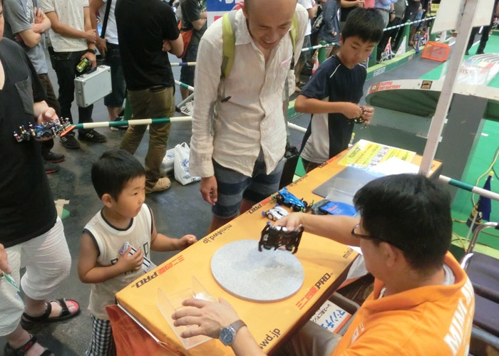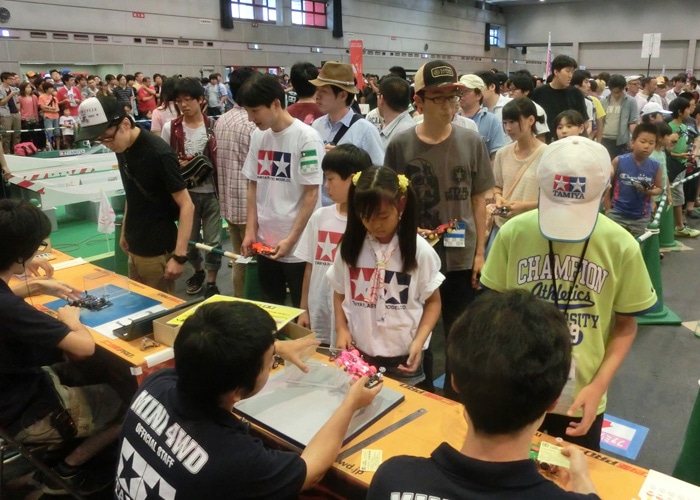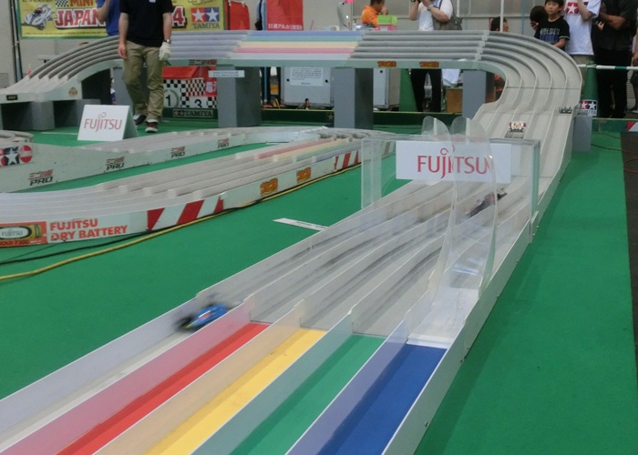 ■会場 :ツインメッセ静岡(静岡県静岡市) ミニ四駆日本一を決める「富士通 乾電池 提供 ミニ四駆ジャパンカップ2014」はタミヤのお膝元・静岡に戻って、ホビーショーやタミヤフェアでもおなじみ「ツインメッセ静岡」での開催です。 サーキットはフジヤマチェンジャーなど数々の難セクションを備えたジャパンカップ2014共通「スーパーグライドサーキット2014」。今回は三連休の中日とあって、静岡観光もかねて(?)多数の選手が来場、参加人数は合計1,785名を記録しました。レースでは、そろそろフジヤマチェンジャーを安定してクリアし、速度域を上げてくる選手も見受けられるようになりましたが、そういった選手の一部が今度はオーバースピードでハイパージャンクションに突入しコースアウトといったケースも。ジャパンカップのサーキットともなると、完全攻略は一筋縄ではいきません。今回も、王者に拍手を! |