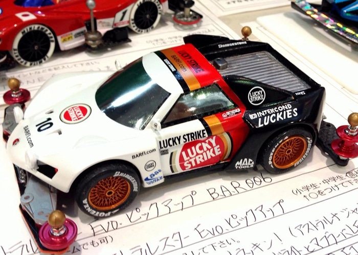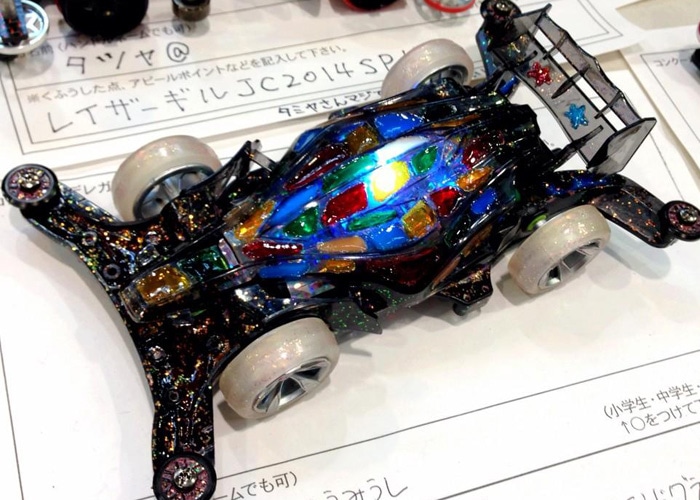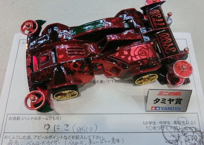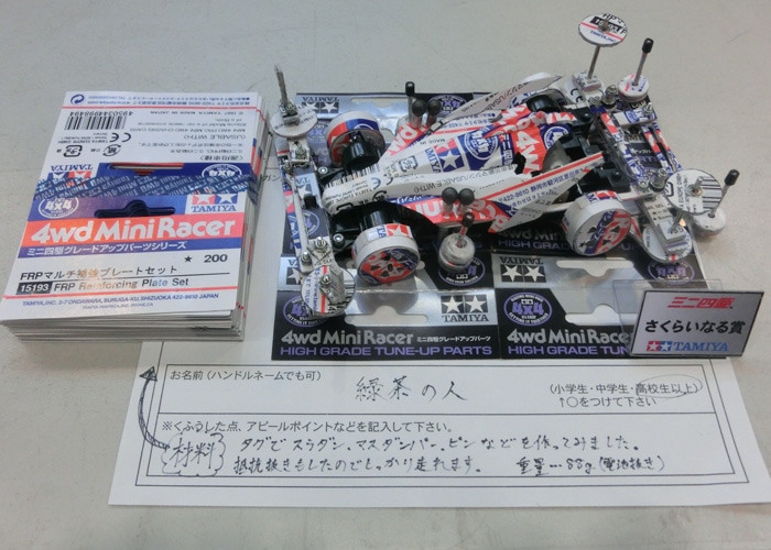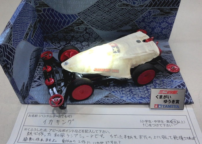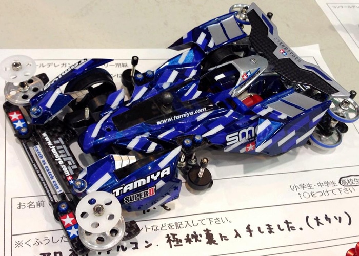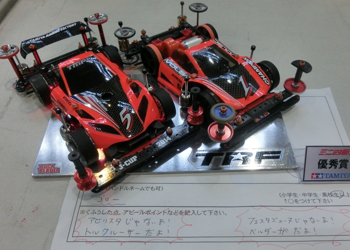 ・優勝車スペック ボディ:アバンテMk.III アズールクリヤーボディ シャーシ:スーパーX モーター:ハイパーダッシュ2 ギヤ比: 3.5:1 タイヤ:大径改造 |