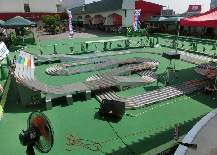 sglideジュニアカップですが、「スーパーグライドサーキット2014」そのまま!やさしくはなっていません! 02東武百貨店の屋上にミニ四駆サーキット出現!夏だなあ…。 03MCのお二人やスタッフも汗をかきながらの進行。ご参加の皆さんも熱中症にはくれぐれもご注意を。