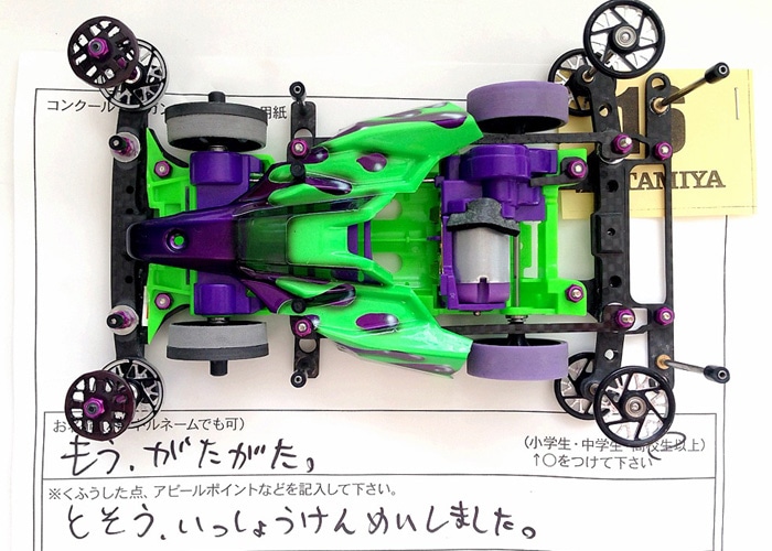 ・優勝車スペック ボディ:サンダーショットMk.II クリヤーボディ シャーシ:スーパーFM モーター:パワーダッシュ ギヤ比:3.5:1 タイヤ:大径カスタム |