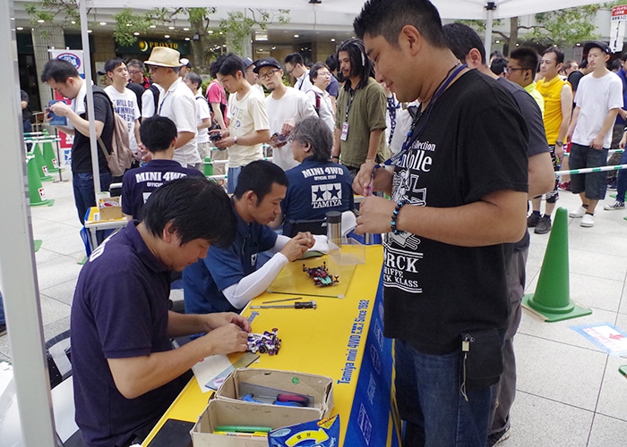 ミニ四駆公認競技会規則(2018特別ルール)に沿って、レース直前に行われる車検の様子。緊張の瞬間です!