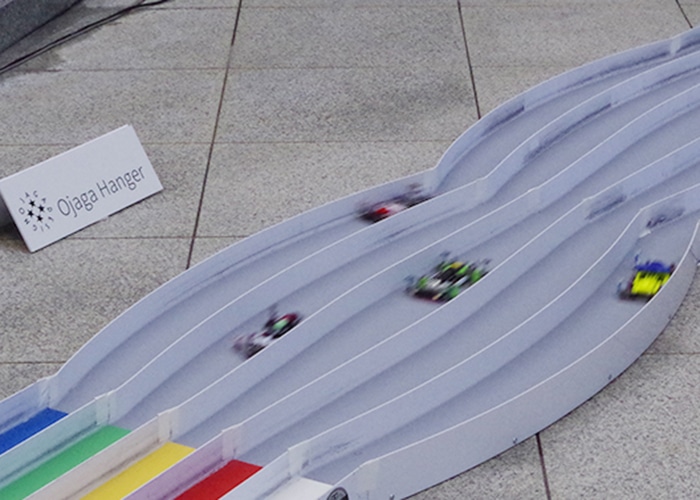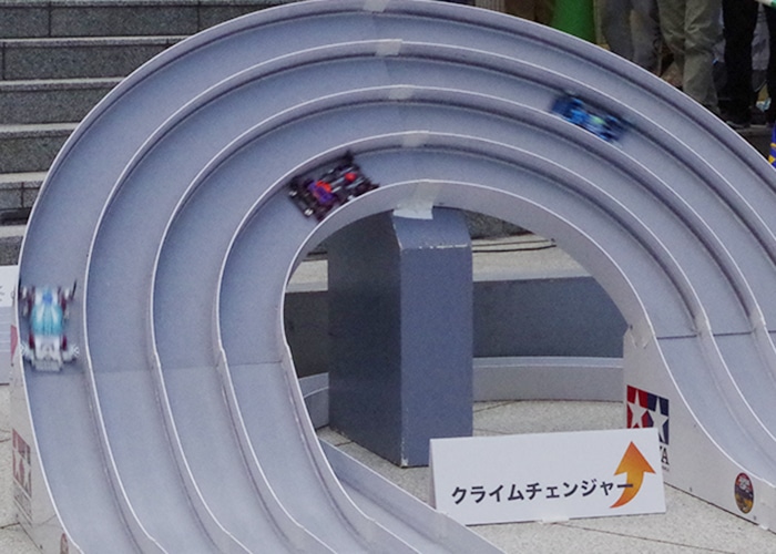 ●ミニ四駆グランプリ2018Winter東京大会 公式コース『クラシックサーキット タイプ2 2018』(約184m)。 1989年のジャパンカップを模したレイアウトとなっております。まずスタートして待ち構えるのは、マシンに勢いをつける『超ロングストレート』、立ち上がりの速さが重要になります。次にカーブを曲がった後の2連続ルーズロード『Ojaga Hanger』が、マシンの動きに影響を与えます。続く『3連バウンシングストレート』では東京大会Dと東京大会では設置方向が変更となり、その後のレーンチェンジ『クライムチェンジャー』を通過してすぐの立体セクション『アイガースロープEvo.』と『ステップアイガー』でマシンのバランスが求められます。そして最後のフラットコーナーセクション『ダッシュターン』を無事に通過できたマシンがウイニングランを迎えます。