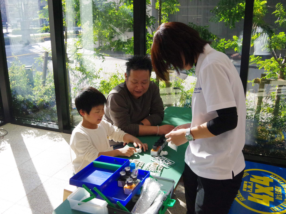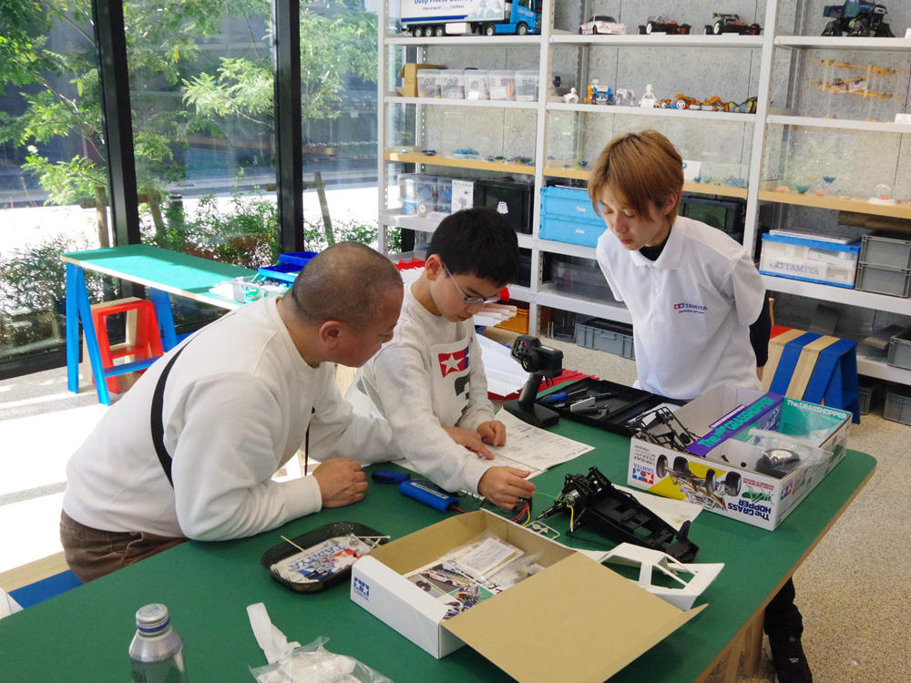 「グラスホッパー親子組み立て教室」をTAMIYA PLAMODEL FACTORY TOKYOで開催しました。 難しい箇所は特別に出来上がったものを準備し、インストラクターの指導のもと組み立ては スムーズに進み、みなさん、グラスホッパーを完成させました。