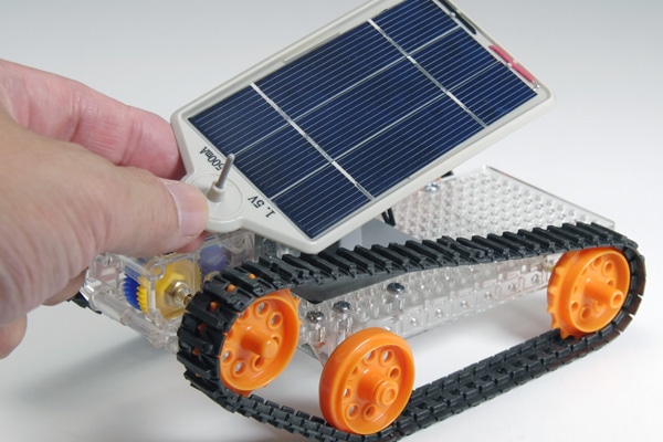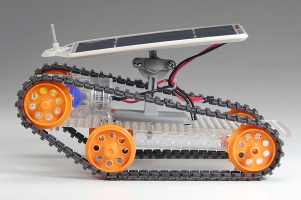 履帯(キャタピラ)をソーラーパネルとモーターで動かす探査車型工作です。シンプルな構造ながら、本物の惑星探査車のように太陽光を受けて動き、凸凹道でもなんなく走破していきます。 ⇒動きを映像でチェック
