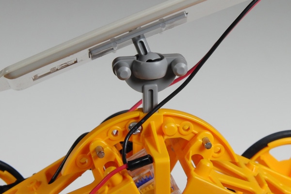 歩くようにゆっくり進み障害物を乗り越える、四輪駆動車の工作セット「ホイールウォーカー」にソーラーパネルを取り付けました。太陽の光があれば、ず〜っと走り続けます。作り方はホイールウォーカーのキットの組立て説明図に掲載。手軽に挑戦できます。 ⇒動きを映像でチェック