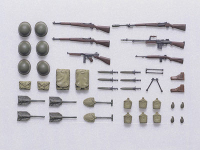 第二次大戦中のアメリカ軍歩兵の装備品を集めたセットです。M1ガーランドライフルや映画「プライベートライアン」や「コンバット」などでお馴染みのトンプソンマシンガン、ブローニング・オートマチックライフルなどの小火器から、ヘルメットや水筒、ハバーザックなどの装備も加えたバラエティー豊かな内容で、アメリカ軍兵士の人形や戦車モデルを効果的に演出します。 |