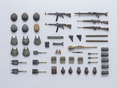 【使い方の工夫も楽しい、装備品アクセサリー】兵士の手に持たせたり、車輛の上に置いたり、使い方の工夫で作品の表情も大きく変わります。小銃やサブマシンガンなどの小火器に加え、ヘルメットや水筒、雑のうなど主に第二次大戦初期から中期にかけてドイツ軍兵士に支給された装備品のセットです。シリーズに揃ったドイツ軍兵士と組み合わせたり、車輛のアクセサリーとしても活躍します。【スペック】パーツ数約80 |