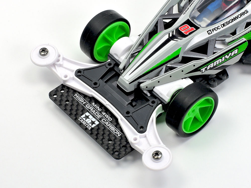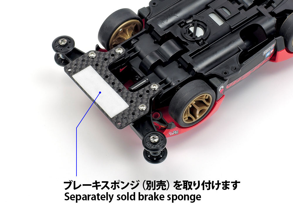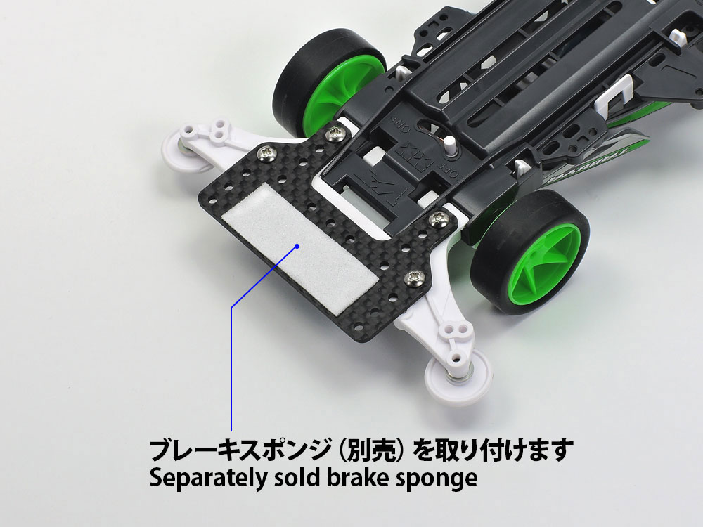 Getting your brake setup right is particularly key on undulating Mini 4WD circuits, and this lightweight, rigid 1.5mm thickness carbon fiber brake stay will help you do just that. There is plenty of space to stick your brake sheet on, and its shape is designed to keep out of the way of rollers while giving you plenty of holes to fix mass dampers and other accessories to. It really looks the part with its carbon fiber pattern and white printed logos, too. ★Brake sponge is sold separately. ★Can be fitted front and rear. ★Do not use cleaners as they may damage the printed areas. ★Small parts for attachment are included.