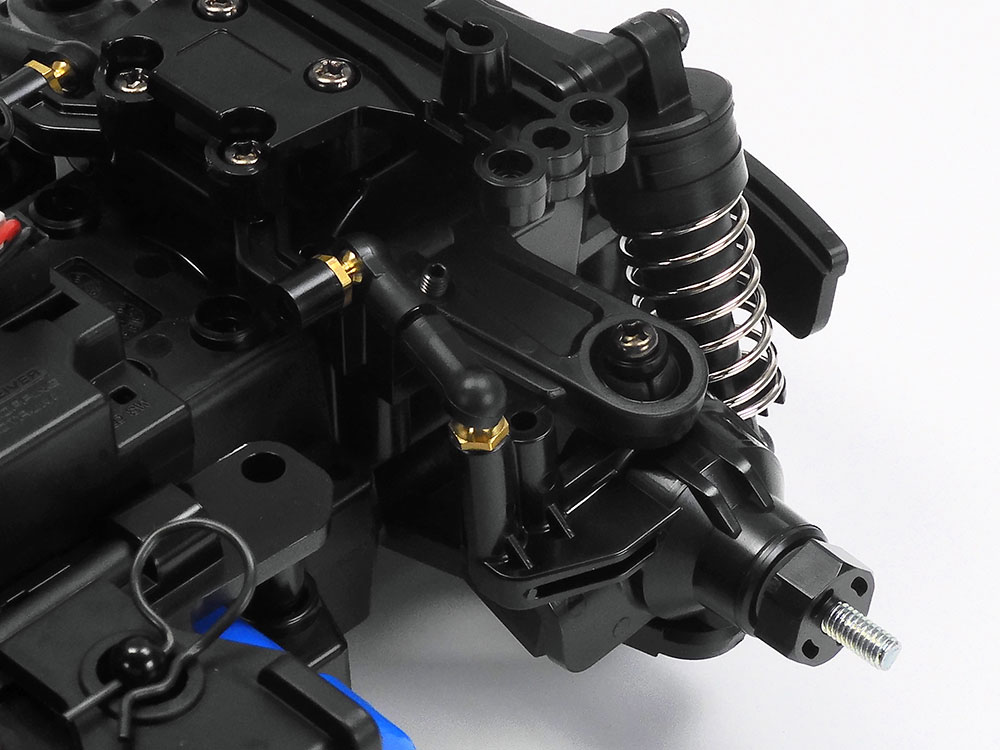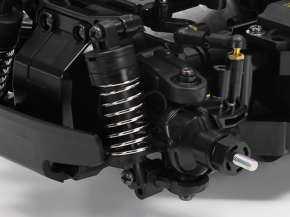 The compact, 2WD MB-01 chassis gives a choice of three types of wheelbase, and front- or rear- wheel drive system. This model employs a front-wheel drive setup. Without removing battery pack, motor and R/C equipment setups from the center frame, simply change attachment directions of final gears and steering linkage to switch between front- and rear-wheel drive; low or high motor position can be chosen for rear-wheel drive cars. The 4-wheel double wishbone suspension features symmetrical structure and friction dampers. Unitized sections such as motor mount, final gears and suspension facilitate ease of assembly and effective maintenance.