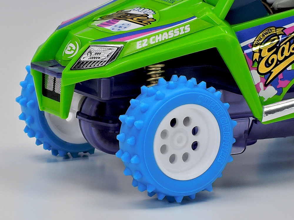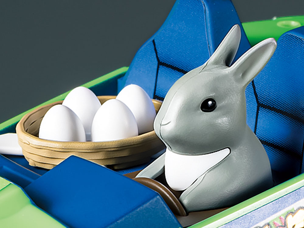 Easter eggs and the Easter Bunny are closely associated with the annual Christian festival of Easter, and they are the stars of this special Easter-themed Mini 4WD car assembly kit. The model uses a UTV-style body molded in light green plastic, and features the pre-assembled and painted bunny inside the roll caged cockpit with a basket of eggs. The 4-wheel drive EZ chassis has a central double-shaft motor and requires no cement or screws. Dish design wheels are paired with spike tires for great performance on slopes.
