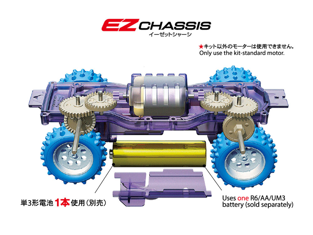 EZ ChassisThe EZ chassis is assembled simply by snapping and fitting parts together, and runs on one R6/AA/UM3 battery. Gears are placed into the chassis frame with a motor on top, and then the cover is snapped into place; chassis parts are violet tinted plastic to let you see what is happening inside. White wheels are paired with grippy spiked tires and the model's 50:1 gear ratio ensures that it runs at a manageable speed and has great torque for a powerful drive.