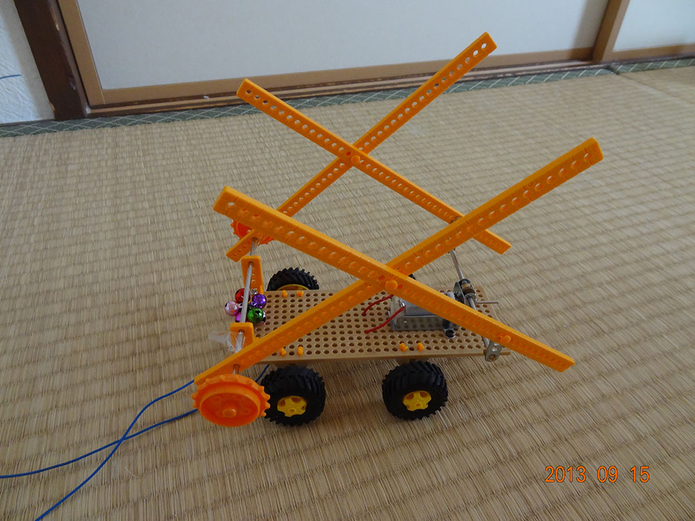 作者: 考太朗 さん (小2・大阪)『自動うちわの研究開発中にひらめいた』という「DAN-RUNお祭りロボット」! DAN-RUNのDANは「ダンシング」、RUNは「ランニング」から来ているというこのメカ、なんとタイヤからの動力伝達はナシ! 通常モードではアームの動きでほふく前進のように進み、逆立ち状態にするとアームを軸に踊るように進むという2パターンの移動が可能な斬新メカ。それじゃあ何がお祭りなのかな…?動画を見れば納得、このメカには鈴が付いているんです! この鈴のおかげでメカが動くたびにシャンシャンサウンドが鳴り響き、部屋はお祭りムード一色に! 家族の団らんを和ませる、かなりゆかいな工作メカです!