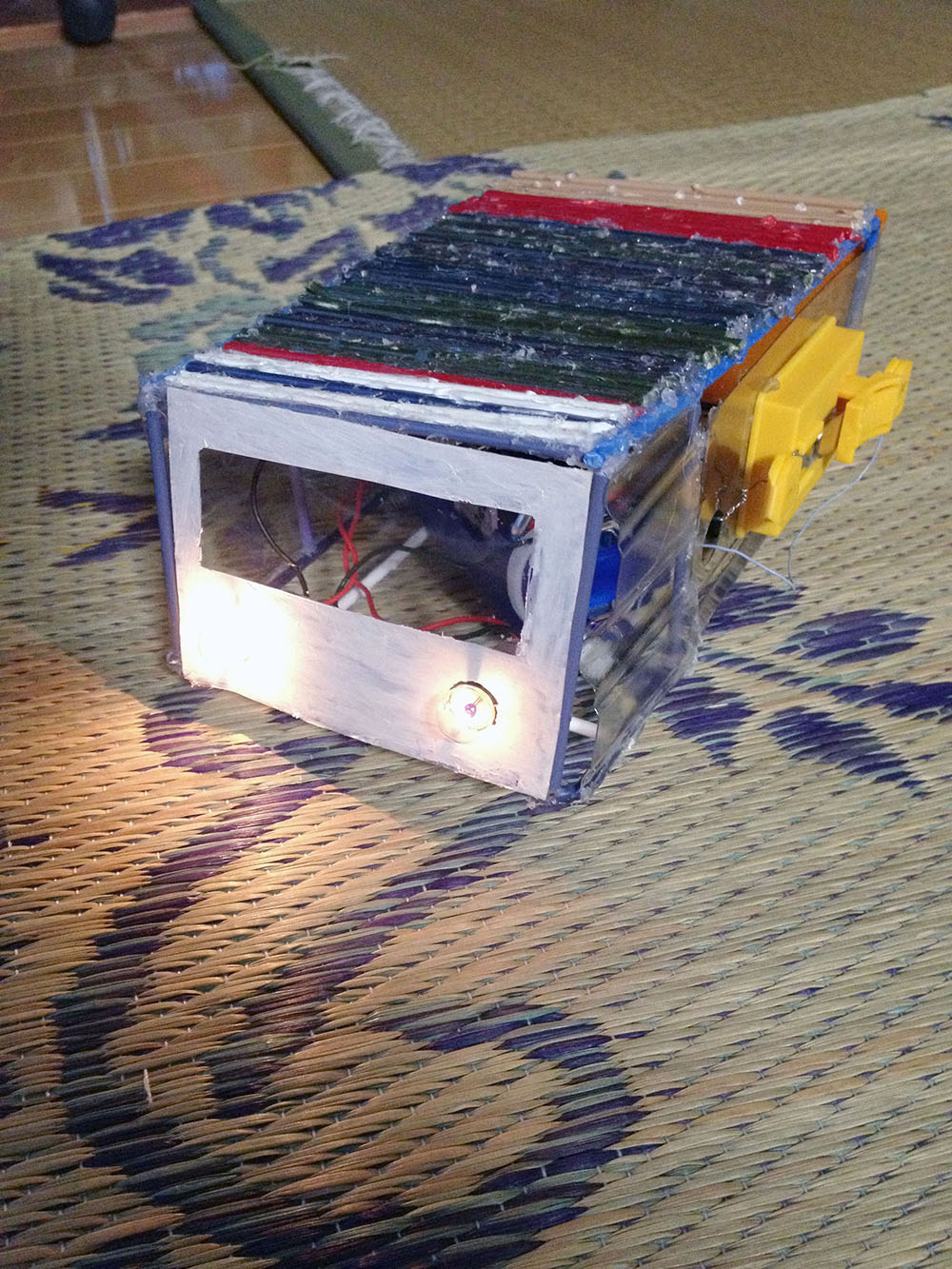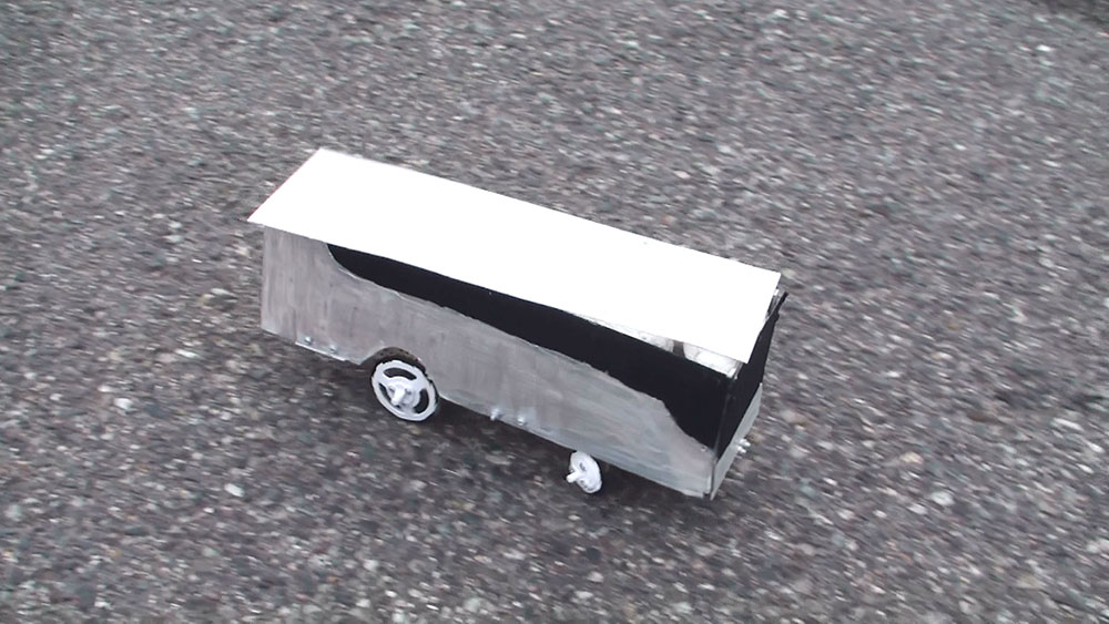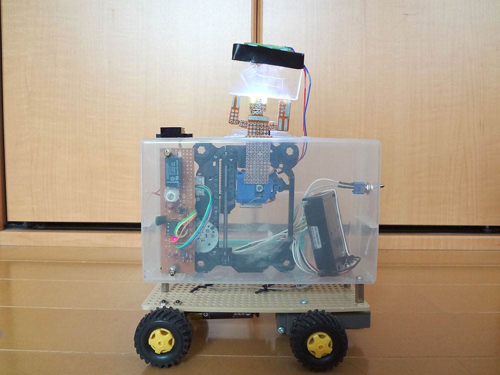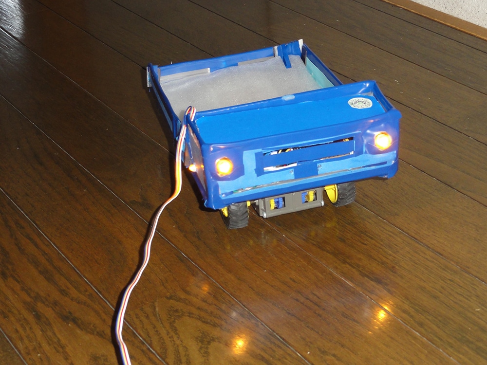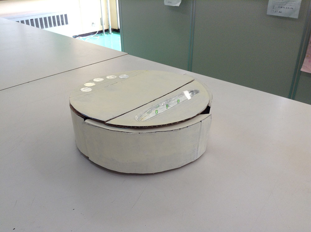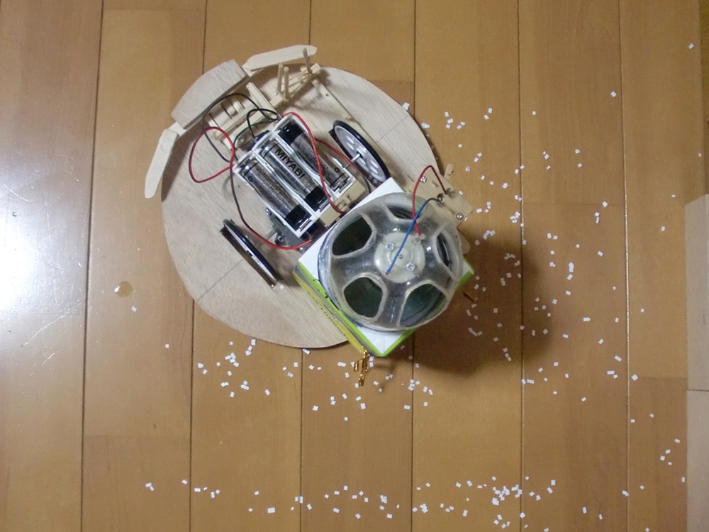 作者: ゆったん (小5・北海道)『こまめに掃除しないとアレルギーで鼻がムズムズする…』とお悩みのゆったんの作品は「お掃除ロボット」! ロボットが壁にぶつかると片方のタイヤが逆回転して方向転換、壁から離れると前進開始するというお掃除ロボの基本動作をしっかり実現しています。注目すべきはそのフォルムで、スイッチ類も含めてすべて紙で作ったというその姿は本格的な掃除ロボットと負けないスタイリッシュぶり。紙だけでここまで作れてしまうとは驚きです!