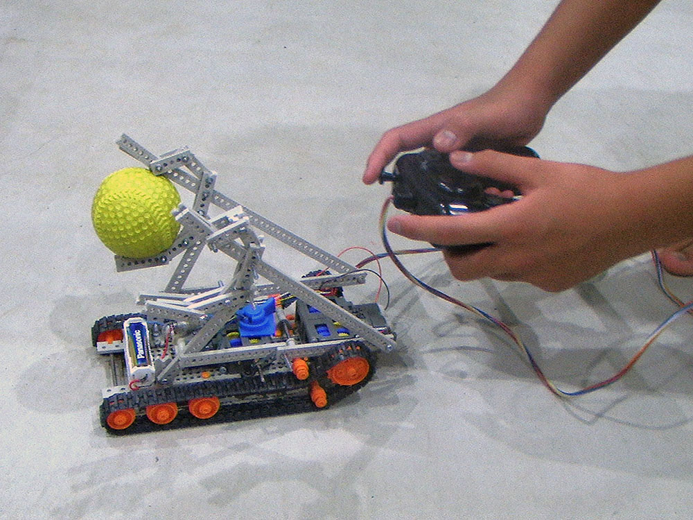 作者: そら さん (小6・東京)同じパーツを使っていても、作者の設計思想次第でまったく違うフォルムに仕上がっていくのがロボット工作の面白さ。そらさんの「ボール運びロボット」は、小さな物をつかめるように開発された作業ロボットです! ご覧の通り、ソフトタイプの野球ボールもしっかり保持できるように仕上がっています。情報によるとピーマンも掴めるとか! メカのレイアウトも美しく、電池ボックスをフロントにおいて重心を前にしている点には工夫を感じます! あと、フロントに3セット配した転輪と、クッと上に跳ね上げられた駆動輪がメカ好きにはグッときます。カッコいいですねぇ…。