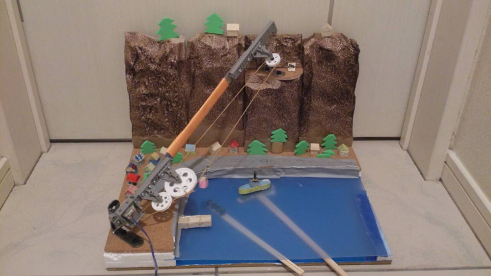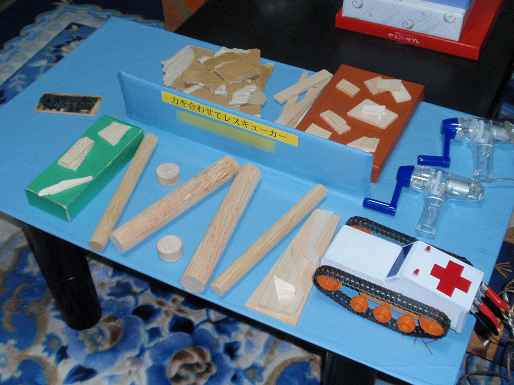 作者: TAKUMA さん (小6・千葉)TAKUMAさんの作品は「力を合わせてレスキューカー」! 手回し式の発電機を2個用意して、右のモーターは右の発電機、左のモーターは左の発電機で制御するというシステム。つまり、操作する2人が息を合わせて操作しないと、まっすぐ走らせることもコーナリングすることもできないというわけです。まさに「力を合わせて」の名にふさわしい作品! レスキューカーの専用コースも手が込んでいて、わいわい楽しみながらレスキュー遊びが楽しめそう。これはやってみたくなりますね!